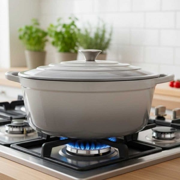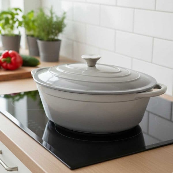 - Stabilność na kuchence: Ciężar i konstrukcja zapewniają stabilne ustawienie na każdej powierzchni grzewczej, zapobiegając przesuwaniu się podczas gotowania.