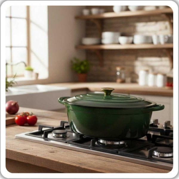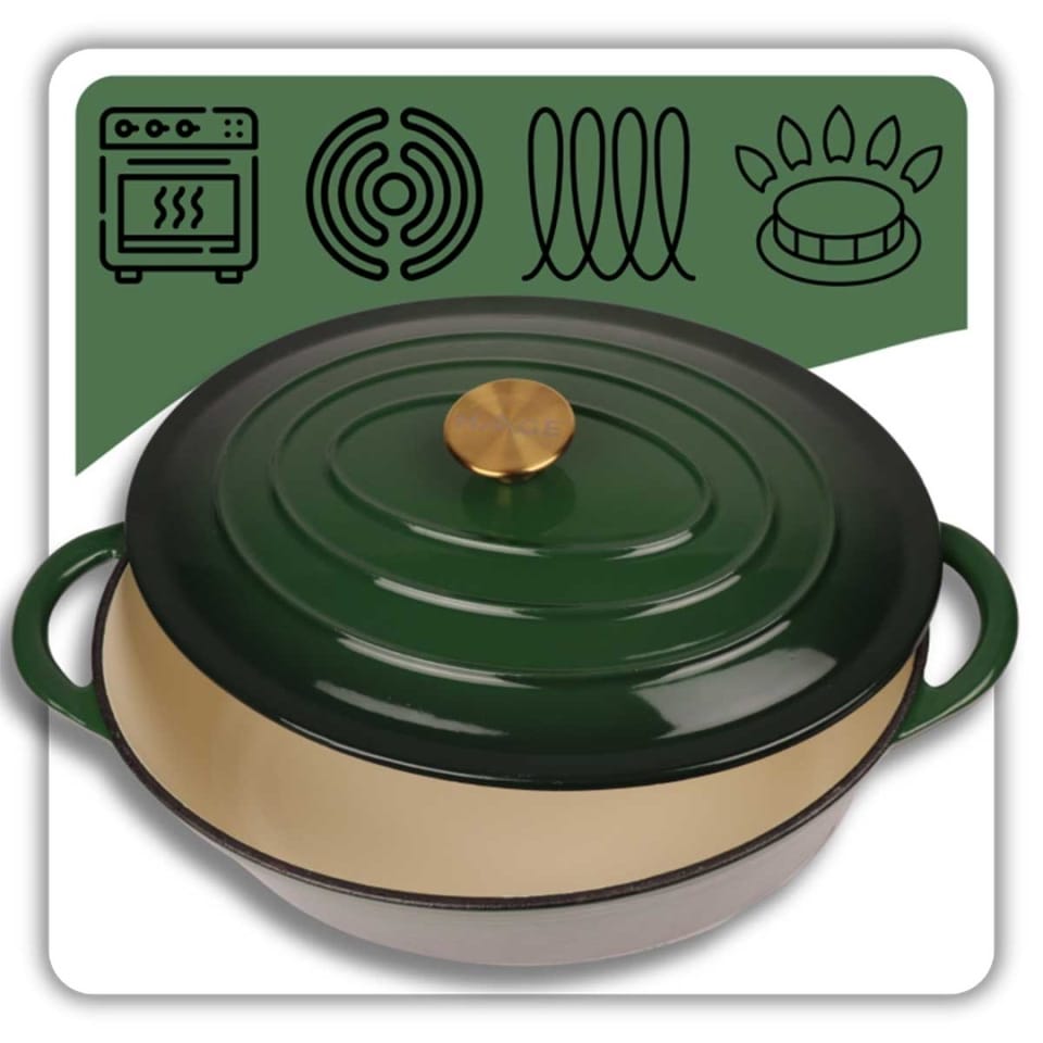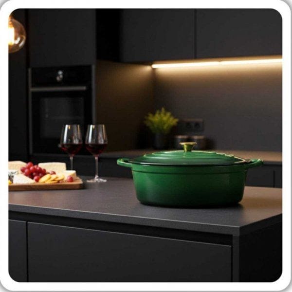 - Elegancki Wygląd i Funkcjonalność: Piękna emalia w kolorze butelkowej zieleni nie tylko nadaje naczyniu wyjątkowego charakteru, ale również chroni żeliwo i ułatwia jego czyszczenie. Brytfanna będzie ozdobą zarówno w kuchni, jak i na stole.