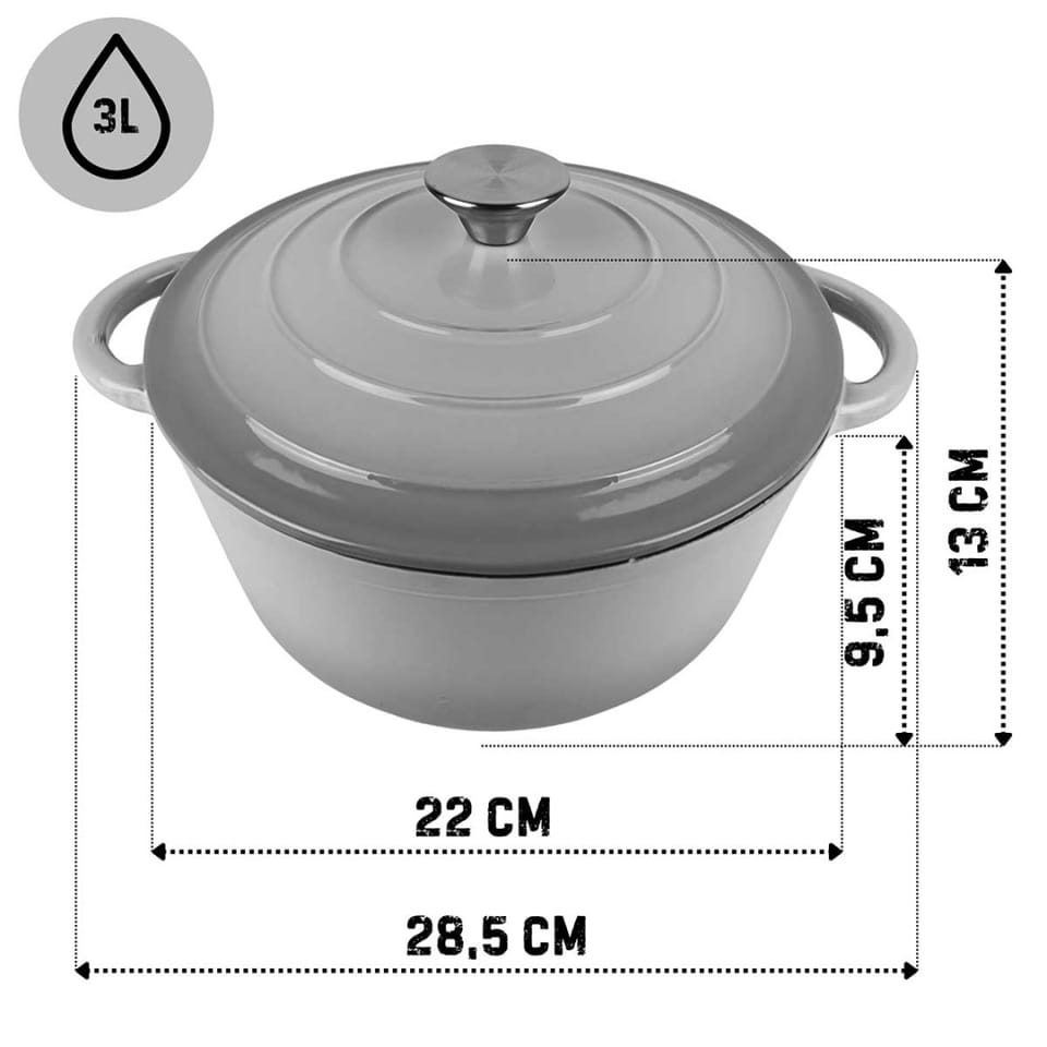 Żeliwny garnek emaliowany w kolorze szarym to wszechstronne naczynie do gotowania, duszenia, zapiekania i pieczenia. . Żeliwo równomiernie się nagrzewa i długo utrzymuje ciepło, co pozwala oszczędzać energię. Garnek nadaje się do wszystkich rodzajów kuchenek, w tym indukcyjnych, oraz do piekarnika. Wnętrze garnka wymaga okresowej impregnacji olejem. Naczyń żeliwnych nie należy myć w zmywarkach. Zaleca się mycie ręczne.