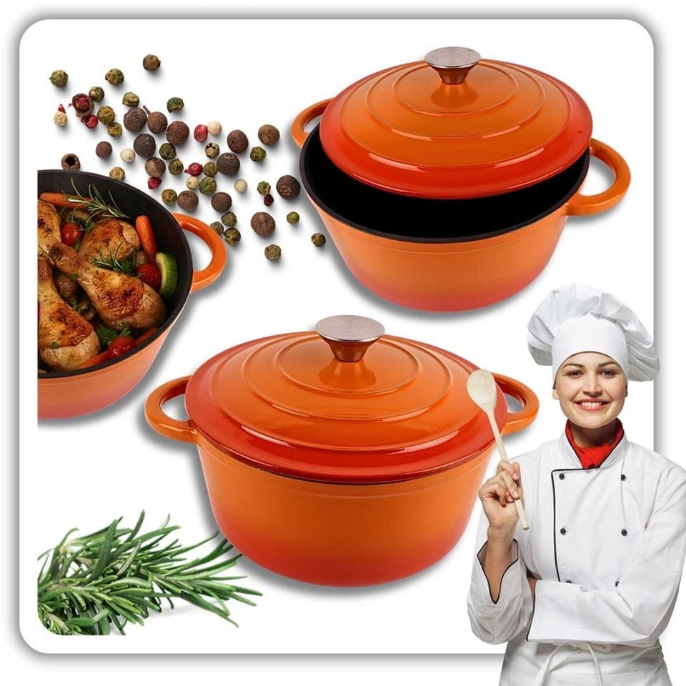 Żeliwny garnek emaliowany w kolorze pomarańczowym to wszechstronne naczynie do gotowania, duszenia, zapiekania i pieczenia. . Żeliwo równomiernie się nagrzewa i długo utrzymuje ciepło, co pozwala oszczędzać energię. Garnek nadaje się do wszystkich rodzajów kuchenek, w tym indukcyjnych, oraz do piekarnika. Wnętrze garnka wymaga okresowej impregnacji olejem. Naczyń żeliwnych nie należy myć w zmywarkach. Zaleca się mycie ręczne i wytarcie do sucha aby uniknąć pojawienia się rdzawych nalotów.