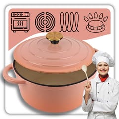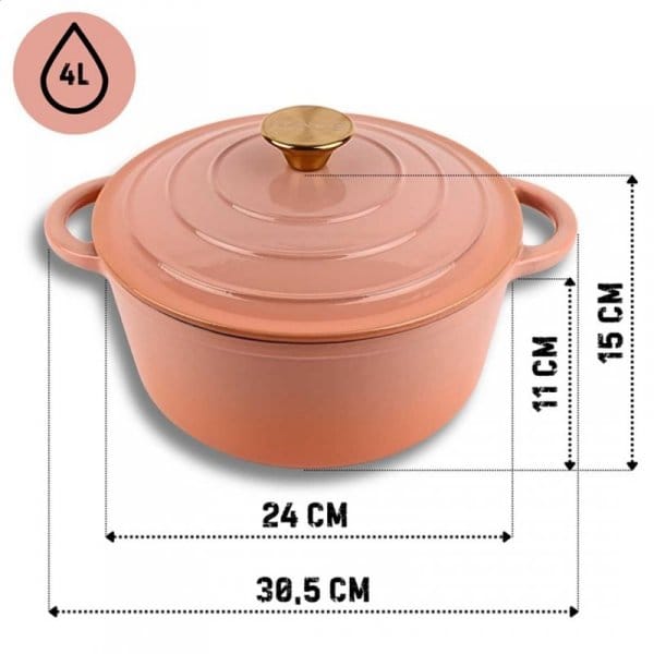 Żeliwny garnek emaliowany w kolorze różowym to wszechstronne naczynie do gotowania, duszenia, zapiekania i pieczenia. Wnętrze pokryte jest jasnobeżową porcelanową emalią, która tworzy gładką, nieprzywierającą powierzchnię o właściwościach antybakteryjnych i antyalergicznych. Żeliwo równomiernie się nagrzewa i długo utrzymuje ciepło, co pozwala oszczędzać energię. Garnek nadaje się do wszystkich rodzajów kuchenek, w tym indukcyjnych, oraz do piekarnika. Nie wymaga impregnacji i jest łatwy w czyszczeniu.