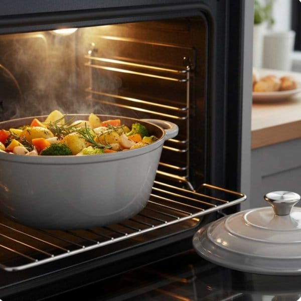- Wielofunkcyjność: Idealny do gotowania na wszystkich typach kuchenek, w tym indukcyjnych. Doskonale sprawdzi się także w piekarniku, dzięki swojej zdolności do długotrwałego utrzymywania ciepła.