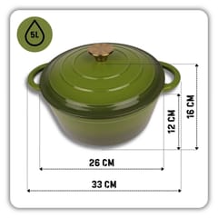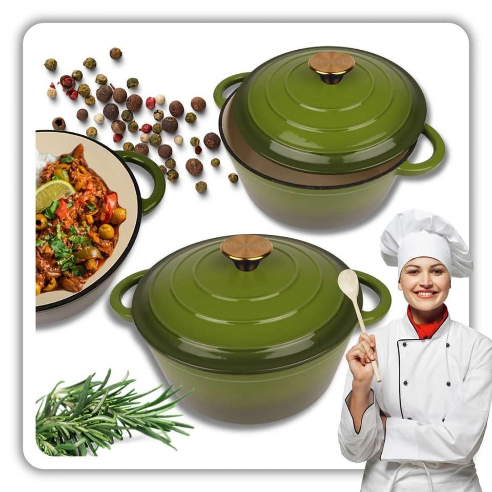Żeliwny garnek emaliowany w kolorze oliwkowym to wszechstronne naczynie do gotowania, duszenia, zapiekania i pieczenia. Wnętrze pokryte jest jasnobeżową porcelanową emalią, która tworzy gładką, nieprzywierającą powierzchnię o właściwościach antybakteryjnych i antyalergicznych. Żeliwo równomiernie się nagrzewa i długo utrzymuje ciepło, co pozwala oszczędzać energię. Garnek nadaje się do wszystkich rodzajów kuchenek, w tym indukcyjnych, oraz do piekarnika. Nie wymaga impregnacji i jest łatwy w czyszczeniu.