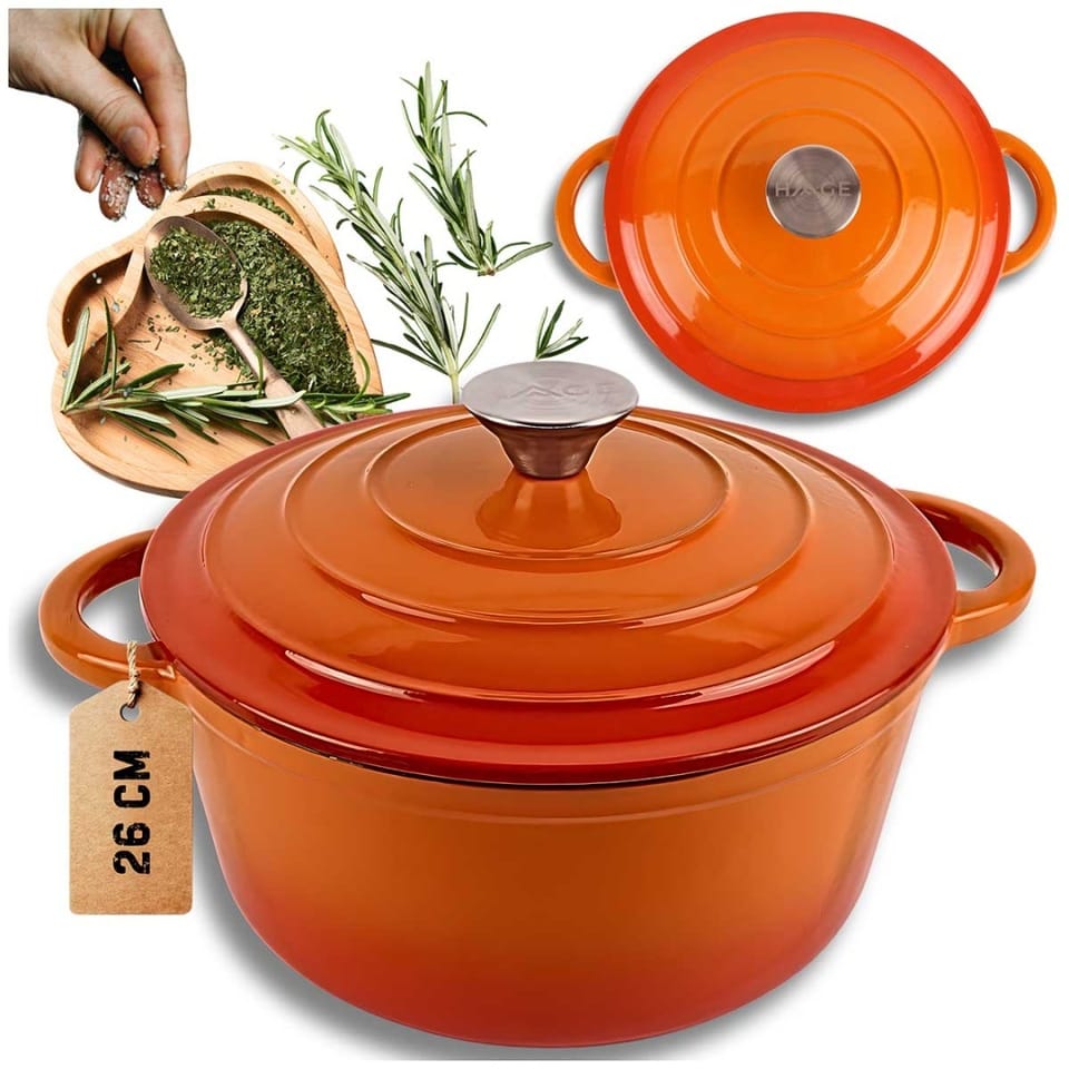 Żeliwny garnek emaliowany w kolorze pomarańczowym to wszechstronne naczynie do gotowania, duszenia, zapiekania i pieczenia. . Żeliwo równomiernie się nagrzewa i długo utrzymuje ciepło, co pozwala oszczędzać energię. Garnek nadaje się do wszystkich rodzajów kuchenek, w tym indukcyjnych, oraz do piekarnika. Wnętrze garnka wymaga okresowej impregnacji olejem. Naczyń żeliwnych nie należy myć w zmywarkach. Zaleca się mycie ręczne i wytarcie do sucha aby uniknąć pojawienia się rdzawych nalotów.