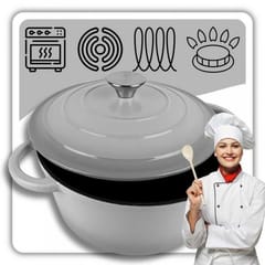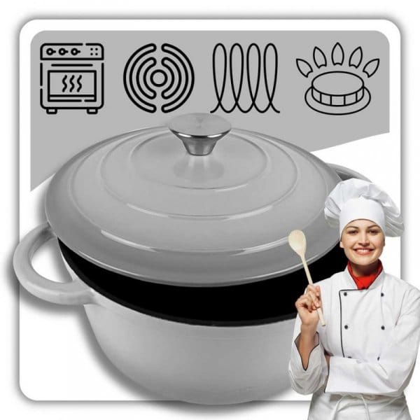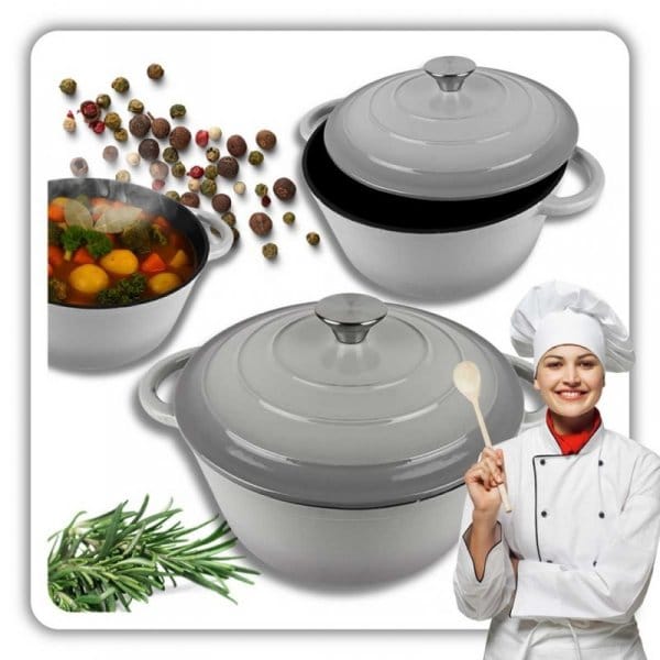 Żeliwny garnek emaliowany w kolorze szarym to wszechstronne naczynie do gotowania, duszenia, zapiekania i pieczenia. . Żeliwo równomiernie się nagrzewa i długo utrzymuje ciepło, co pozwala oszczędzać energię. Garnek nadaje się do wszystkich rodzajów kuchenek, w tym indukcyjnych, oraz do piekarnika. Wnętrze garnka wymaga okresowej impregnacji olejem. Naczyń żeliwnych nie należy myć w zmywarkach. Zaleca się mycie ręczne.
