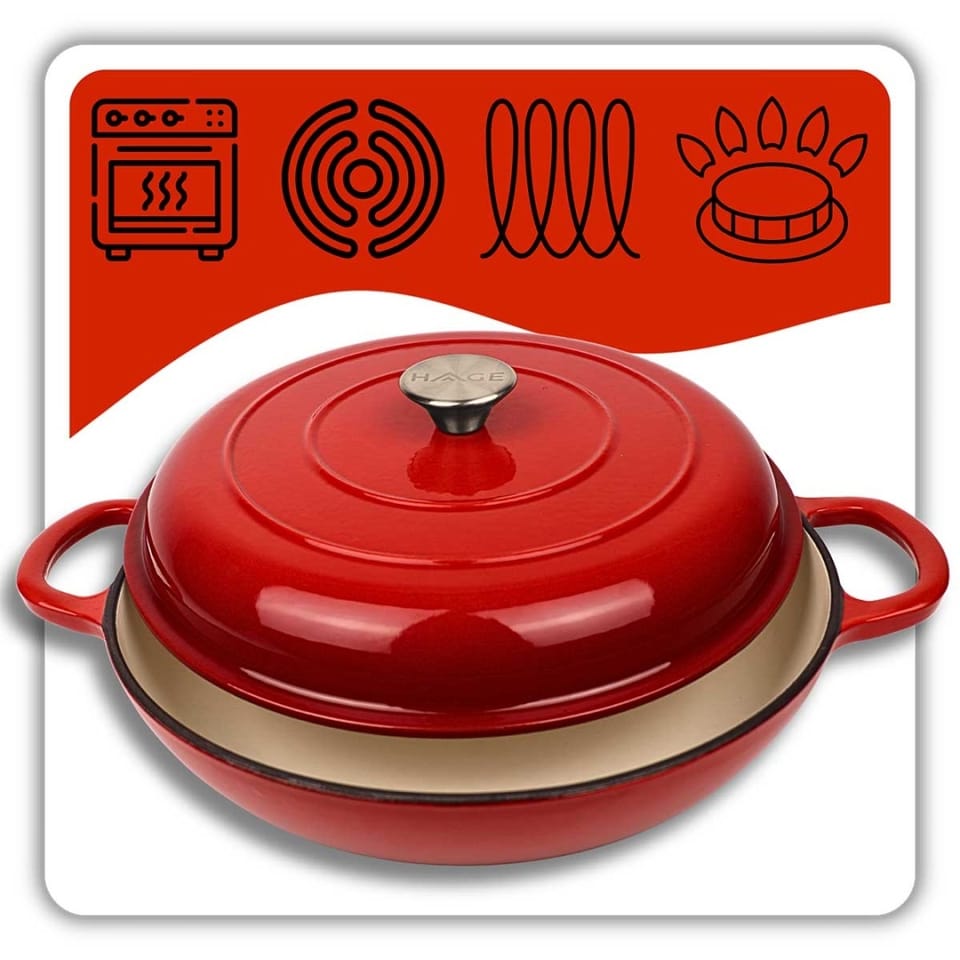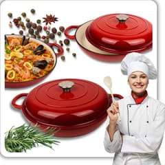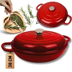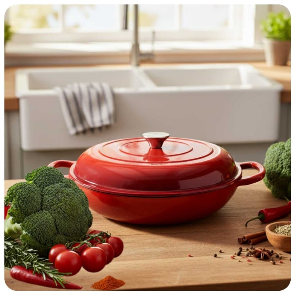 Płaski żeliwny garnek emaliowany w kolorze czerwonym to wszechstronne naczynie do gotowania, duszenia, zapiekania i pieczenia. Wnętrze pokryte jest jasnobeżową porcelanową emalią, która tworzy gładką, nieprzywierającą powierzchnię o właściwościach antybakteryjnych i antyalergicznych. Żeliwo równomiernie się nagrzewa i długo utrzymuje ciepło, co pozwala oszczędzać energię. Garnek nadaje się do wszystkich rodzajów kuchenek, w tym indukcyjnych, oraz do piekarnika. Nie wymaga impregnacji i jest łatwy w czyszczeniu.