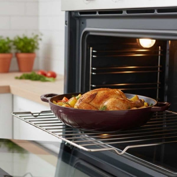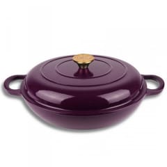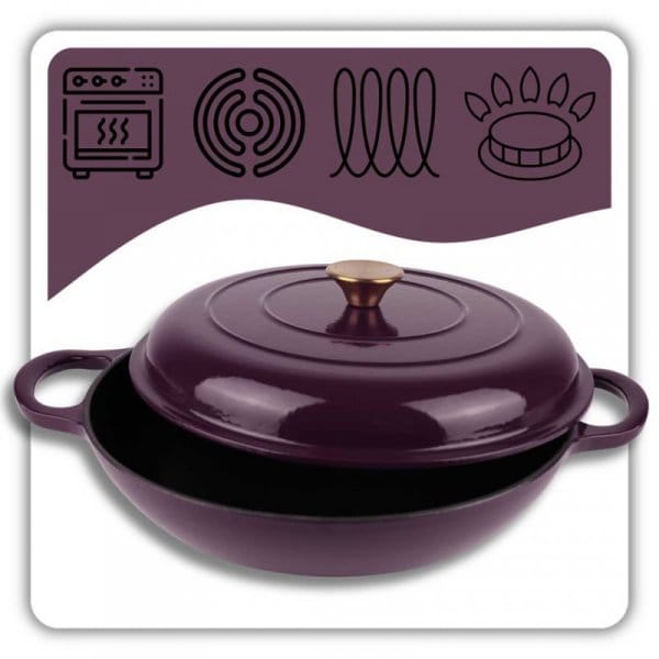 Marzysz o eleganckim, funkcjonalnym garnku, który będzie ozdobą Twojej kuchni, a jednocześnie posłuży Ci przez długie lata?Płaski żeliwny garnek emaliowany w kolorze bakłażanowym to wszechstronne naczynie do gotowania, duszenia, zapiekania i pieczenia. Wnętrze pokryte jest jasnobeżową porcelanową emalią, która tworzy gładką, nieprzywierającą powierzchnię o właściwościach antybakteryjnych i antyalergicznych. Żeliwo równomiernie się nagrzewa i długo utrzymuje ciepło, co pozwala oszczędzać energię. Garnek nadaje się do wszystkich rodzajów kuchenek, w tym indukcyjnych, oraz do piekarnika. Nie wymaga impregnacji i jest łatwy w czyszczeniu. SPECYFIKACJA: Wysokość całkowita bez uchwytu: 10,5 cm Kolor: bakłażanowy - eggplant Pojemność max: 3 l Średnica garnka: 30 cm Szerokość całkowita z rączkami: 40,5 cm Wysokość bez pokrywki: 6 cm Materiał: żeliwo emaliowane (na zewnątrz i wewnątrz) Przystosowany do wszystkich typów kuchenek, także indukcyjnych oraz piekarników.ZALETY PRODUKTU: Trwałość na lata: Żeliwo to materiał, który zapewnia równomierne rozprowadzanie ciepła, co gwarantuje doskonałe efekty gotowania. Wielofunkcyjność: Idealny do gotowania na wszystkich typach kuchenek, w tym indukcyjnych. Doskonale sprawdzi się także w piekarniku, dzięki swojej zdolności do długotrwałego utrzymywania ciepła. Piękny wygląd: Elegancki, bakłażanowy kolor garnka nie tylko dodaje kuchni charakteru i nowoczesności, ale także świetnie komponuje się z innymi naczyniami. Emalia – łatwa w utrzymaniu: Powłoka emaliowana nie tylko zabezpiecza garnek przed korozją, ale także sprawia, że jest łatwa w czyszczeniu. Ekstremalna funkcjonalność: Niezależnie od tego, co gotujesz , nasz garnek z pewnością sprosta każdemu wyzwaniu! Produkt wykonano z najwyższą starannością – jest ręcznie emaliowany.DLACZEGO WARTO WYBRAĆ WŁAŚNIE TEN PRODUKT: Naturalne wzmacnianie smaku potraw: Żeliwo pomaga zachować intensywność aromatów i nadaje potrawom wyjątkowy, smak. Bezpieczeństwo użytkowania: Emalia jest wolna od szkodliwych substancji, takich jak PTFE czy PFOA, co gwarantuje zdrowe gotowanie. Doskonała retencja ciepła: Po nagrzaniu długo utrzymuje temperaturę, co pozwala oszczędzać energię i dłużej cieszyć się gorącym posiłkiem. Uniwersalność stylu: Klasyczny, ponadczasowy design pasuje zarówno do nowoczesnych, jak i rustykalnych kuchni. Stabilność na kuchence: Ciężar i konstrukcja zapewniają stabilne ustawienie na każdej powierzchni grzewczej, zapobiegając przesuwaniu się podczas gotowania....