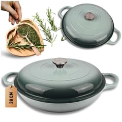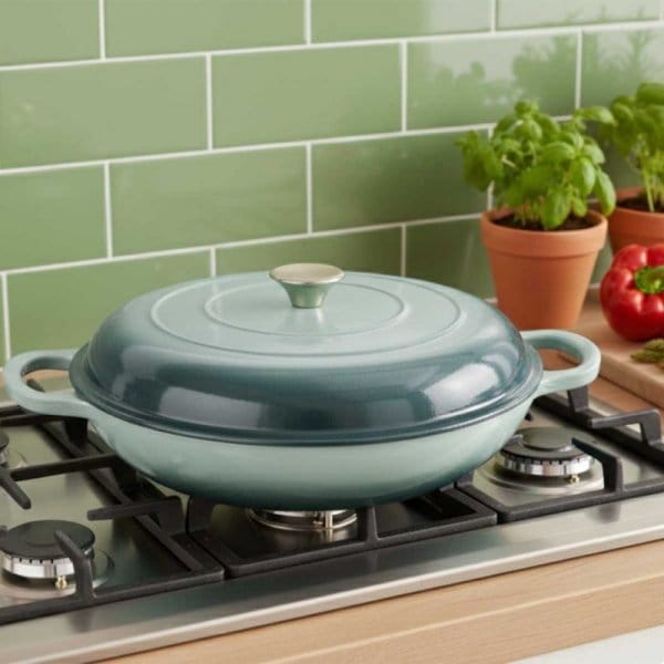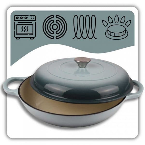 Płaski żeliwny garnek emaliowany w kolorze miętowym to wszechstronne naczynie do gotowania, duszenia, zapiekania i pieczenia. Żeliwo równomiernie się nagrzewa i długo utrzymuje ciepło, co pozwala oszczędzać energię. Garnek nadaje się do wszystkich rodzajów kuchenek, w tym indukcyjnych, oraz do piekarnika. Wnętrze garnka wymaga okresowej impregnacji olejem. Naczyń żeliwnych nie należy myć w zmywarkach. Zaleca się mycie ręczne i wytarcie do sucha aby uniknąć pojawienia się rdzawych nalotów.