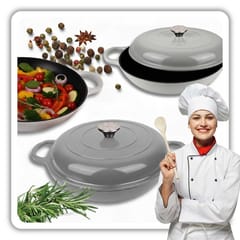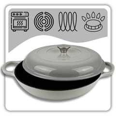 Płaski żeliwny garnek emaliowany w kolorze szarym to wszechstronne naczynie do gotowania, duszenia, zapiekania i pieczenia. Żeliwo równomiernie się nagrzewa i długo utrzymuje ciepło, co pozwala oszczędzać energię. Garnek nadaje się do wszystkich rodzajów kuchenek, w tym indukcyjnych, oraz do piekarnika. Wnętrze garnka wymaga okresowej impregnacji olejem. Naczyń żeliwnych nie należy myć w zmywarkach. Zaleca się mycie ręczne.