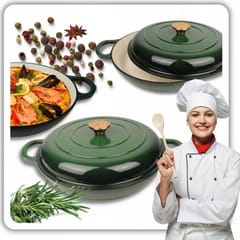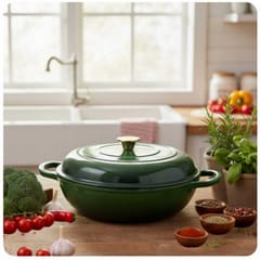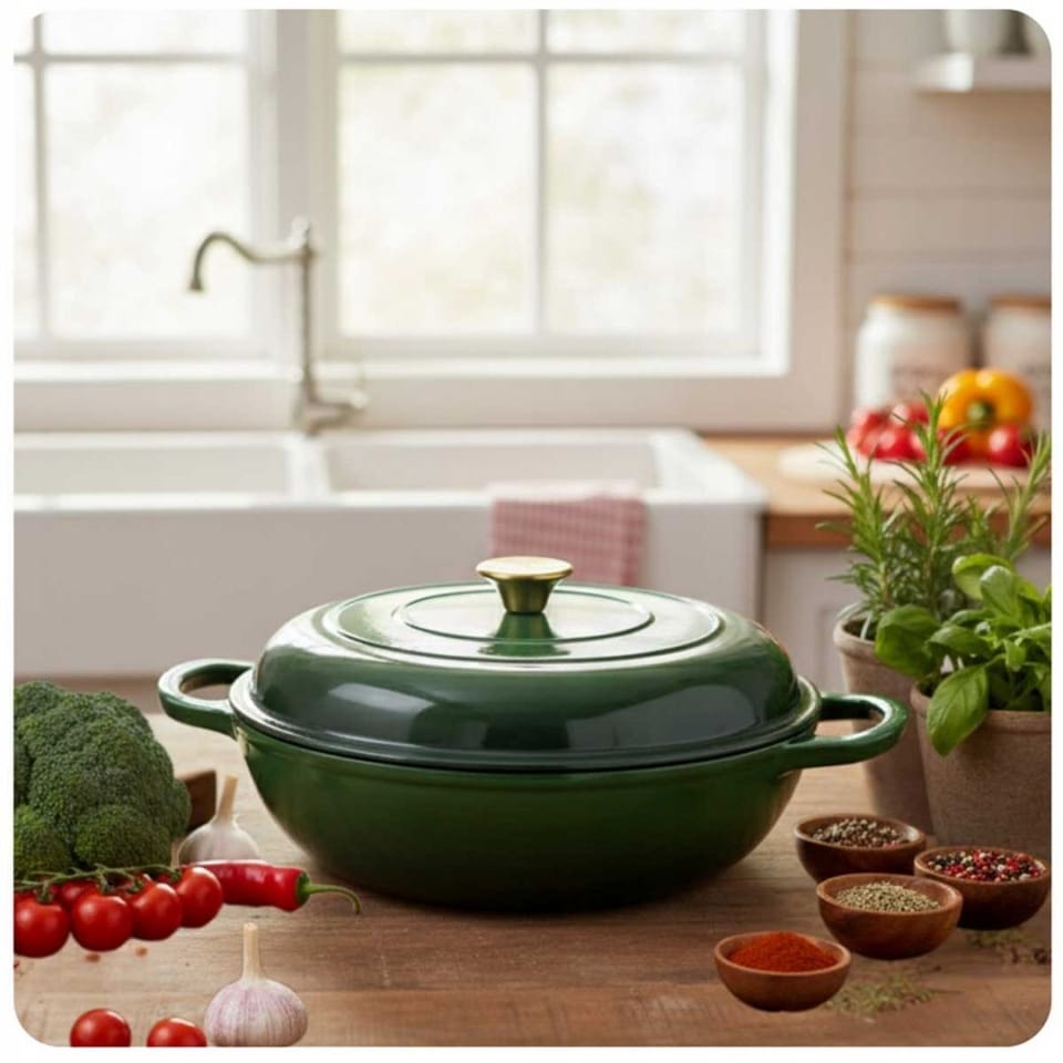 Płaski żeliwny garnek emaliowany w kolorze butelkowa zieleń to wszechstronne naczynie do gotowania, duszenia, zapiekania i pieczenia. Wnętrze pokryte jest jasnobeżową porcelanową emalią, która tworzy gładką, nieprzywierającą powierzchnię o właściwościach antybakteryjnych i antyalergicznych. Żeliwo równomiernie się nagrzewa i długo utrzymuje ciepło, co pozwala oszczędzać energię. Garnek nadaje się do wszystkich rodzajów kuchenek, w tym indukcyjnych, oraz do piekarnika. Nie wymaga impregnacji i jest łatwy w czyszczeniu.