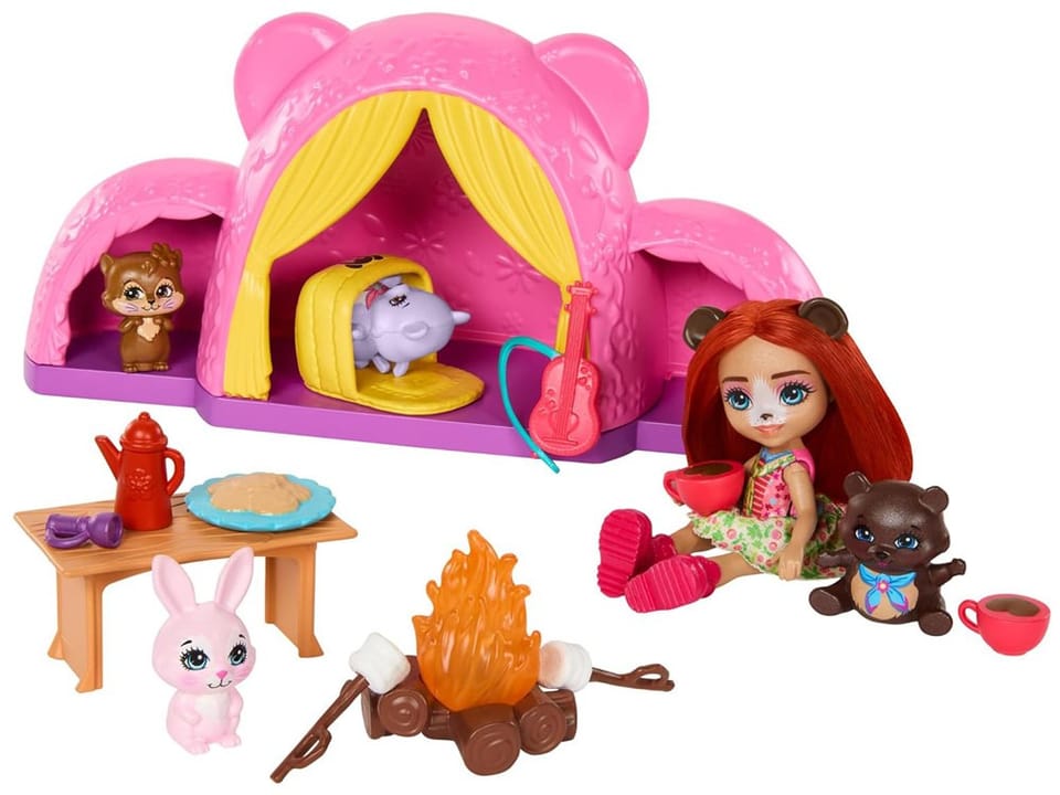 Zestaw zawiera:- lalka Enchantimals miś- 4 figurki zwierzątek- namiot- ognisko- pianki- kosz do spania dla zwierzątek- kapelusik dla lalki- gitara- stół- talerz z ciasteczkami (atrapa)- 2 filżanki- czajniczekWymiary:- wysokość lalki ok. 10 cm- wysokość zwierzaczka ok. 3 cmDaj się oczarować tym słodkim dziewczynkom i ich zwierzątkom! Enchantimals to grupa uroczych dziewczynek związanych ze swoimi ukochanymi zwierzątkami wyjątkową więzią. Zestaw przeznaczony dla każdej malej fanki tych uroczych postaci. W sklepie Jokomisiada znajdziecie Państwo szeroki wybór oryginalnych, nietuzinkowych zabawek.