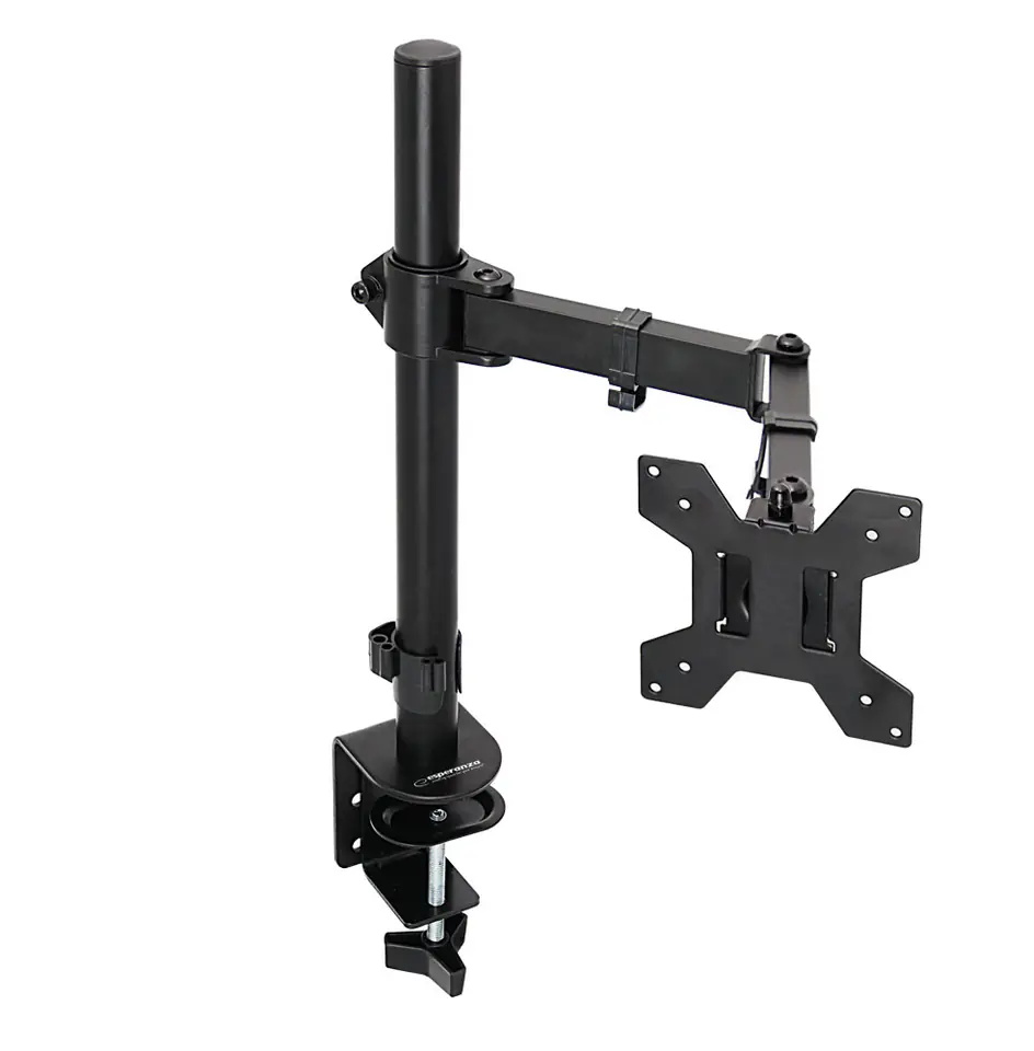 Metalowy, mocny i stabilny uchwyt biurkowy do monitorów komputerowych w rozmiarze 10” do 27”. Pozwala zamontować monitor komputerowy na biurku w taki sposób aby można go było swobodnie regulowac pod kątem widzenia i wyskości, a równocześnie aby monitor nie zajmował miejsca na biurku. Łatwy w montażu. Przytwierdzany do biurka mocnym, regulowanym metalowym imadłem z miękką wyściółką zapobiegającą rysowaniu się blatu biurka. Zgodny ze standardem VESA 75 x 75 mm – 100 x 100 mm. Posiada szeroki zakres regulacji położenia monitora góra/dół, regulację kąta nachylenia monitora oraz możliwość jego obrotu o 360o.