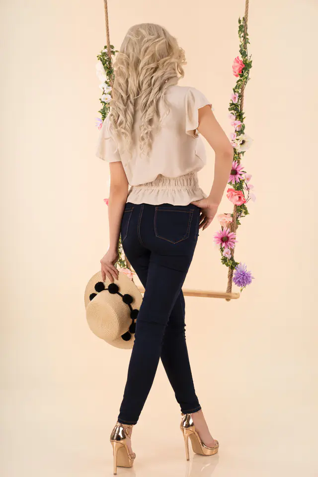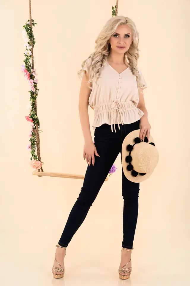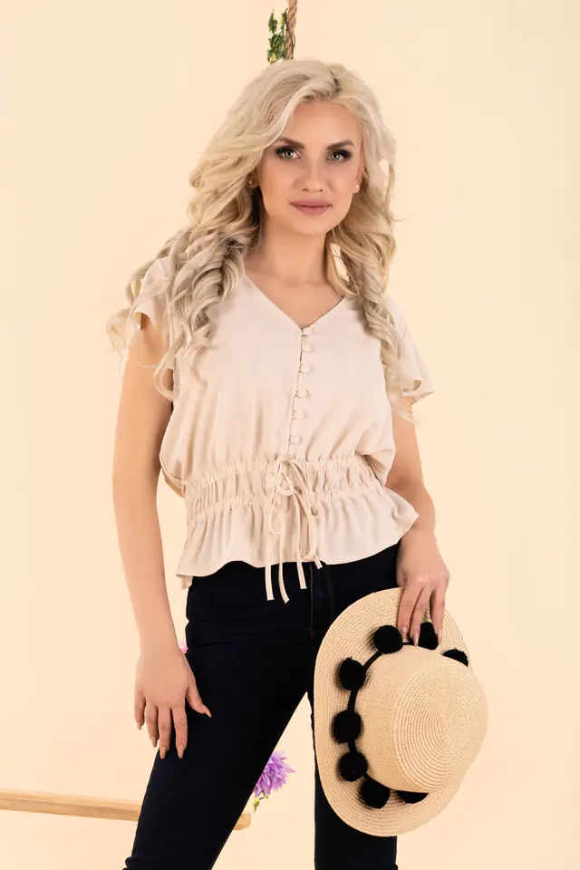 Zwiewna bluzeczka z krótkim - motylkowym ręwawem. Z przodu guziczki obciągnięte tkaniną jak bluzka. W talii marszczenie z wiązaniem.