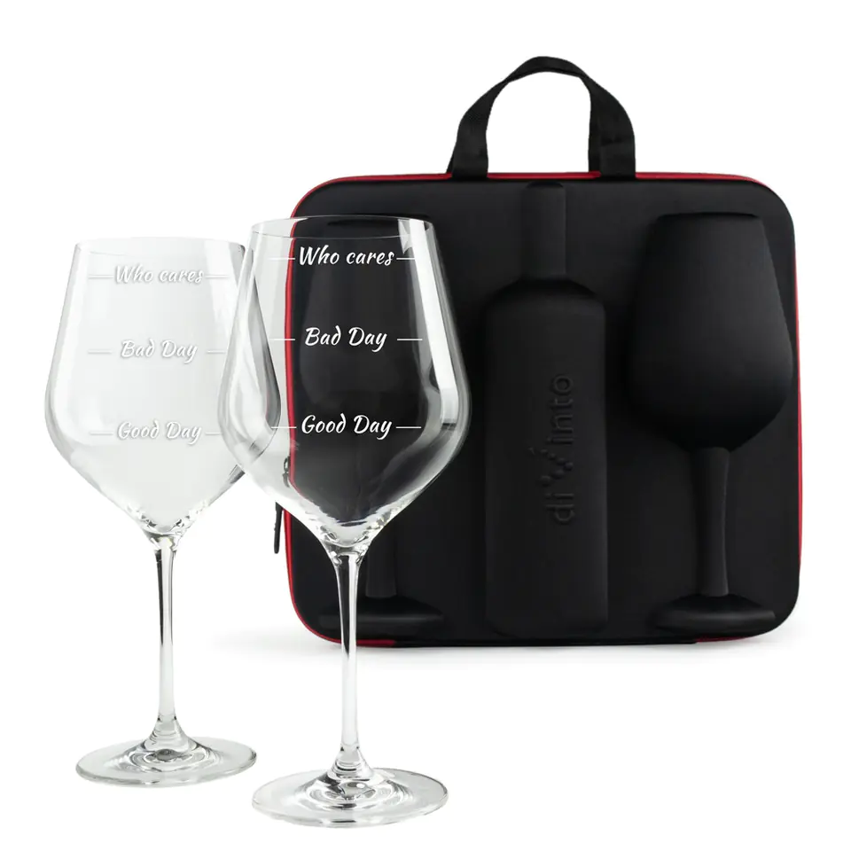 Kieliszki, wino i humor zabierzesz ze sobą Elegancki zestaw, który pozwoli cieszyć się winem w pięknej oprawie i w każdych okolicznościach – tym w skrócie jest Etui na wino z kieliszkami diVinto.Nie tylko zabierzesz je ze sobą dosłownie wszędzie. Dołączone do zestawu gigantyczne kieliszki z nadrukiem są odpowiednie na każdy nastrój i pozwalają spojrzeć na rzeczywistość z humorem.Podróż, wyjazd, piknik czy randka w plenerze – tam, gdzie inne gadżety do wina nie dają już rady, etui dobrze spełni swoją rolę, chroniąc i butelkę, i kieliszki. Etui na wino do zadań specjalnych Solidna konstrukcja etui pozwala bezpiecznie przenosić jego zawartość, a dbałość o detale zrobi dobre wrażenie na obdarowanych osobach.Jeśli chcesz podarować komuś wino w czymś więcej niż zwykłej torebce, etui jest rozwiązaniem stworzonym dla Ciebie. Towarzystwo oryginalnych kieliszków to przepis na prezent, który zapadnie w pamięć i sprawdzi się w wielu sytuacjach.Etui z powodzeniem możesz podarować także bez butelki wina – jego wygląd i zawartość tworzą kompletny, nietuzinkowy prezent dla miłośnika wina. Polecamy w szczególności, gdy nie wiesz, jakie wino wybrać. 3 poziomy napełnienia Gigantyczne kieliszki w zestawie są dwa – bo we dwoje zawsze raźniej! Kuszą nie tylko wyglądem i pojemnością, ale i nadrukiem z przymrużeniem oka, idealnym na każdy nastrój.Dobry dzień od złego różni się tylko ilością alkoholu wypitą na jego koniec, dlatego znajdziesz na nich trzy poziomy napełnienia: Good Day, Bad Day, Who cares.Dzięki nadrukowi łatwiej spojrzeć na rzeczywistość z dystansem, a dzięki gigantycznej pojemności o dolewki nie trzeba się martwić. Jeden zestaw na wiele okazji - Dla Młodej Pary zamiast kwiatów – z butelką wina czy bez, taki prezent pozwoli im spojrzeć na codzienność z dystansem;- Na Walentynki i rocznicę – by w odpowiedniej oprawie wypić za każdy dobry dzień spędzony razem;- Na randkę w plenerze lub na wyjeździe – jeśli chcesz w sekundę wyczarować romantyczny nastrój okraszony odrobiną humoru;- Na urodziny czy Dzień Kobiet – bo to prezent, który miłośniczka wina przyjmie z otwartymi ramionami;- Na wieczór panieński – bo życie po ślubie to mieszanka różnych chwil, do których warto podejść z humorem;- Na babski wieczór - jeśli nocne pogaduchy przy winie to Wasz mały rytuał.