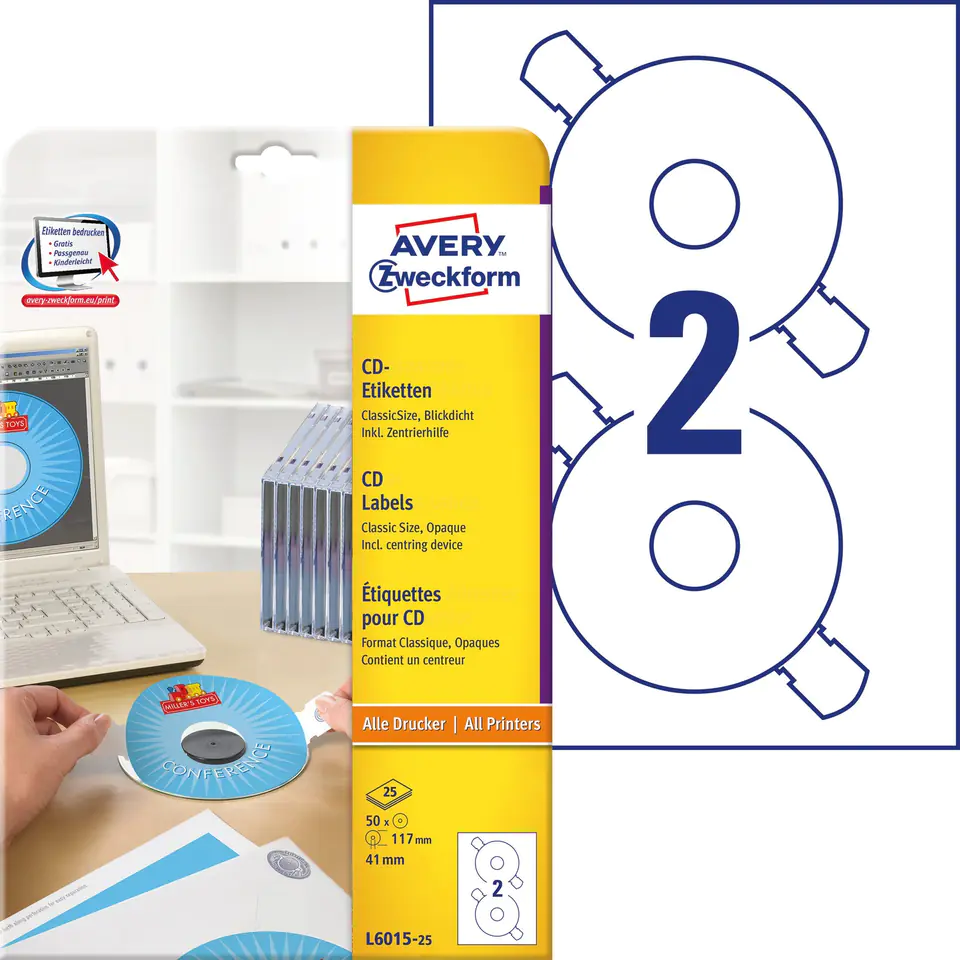 • Etykiety do indywidualnego oznaczania płyt CD w rozmiarze ClassicSize – etykiety pokrywają powierzchnię płyty CD z wyłączeniem jej środkowej przezroczystej części.