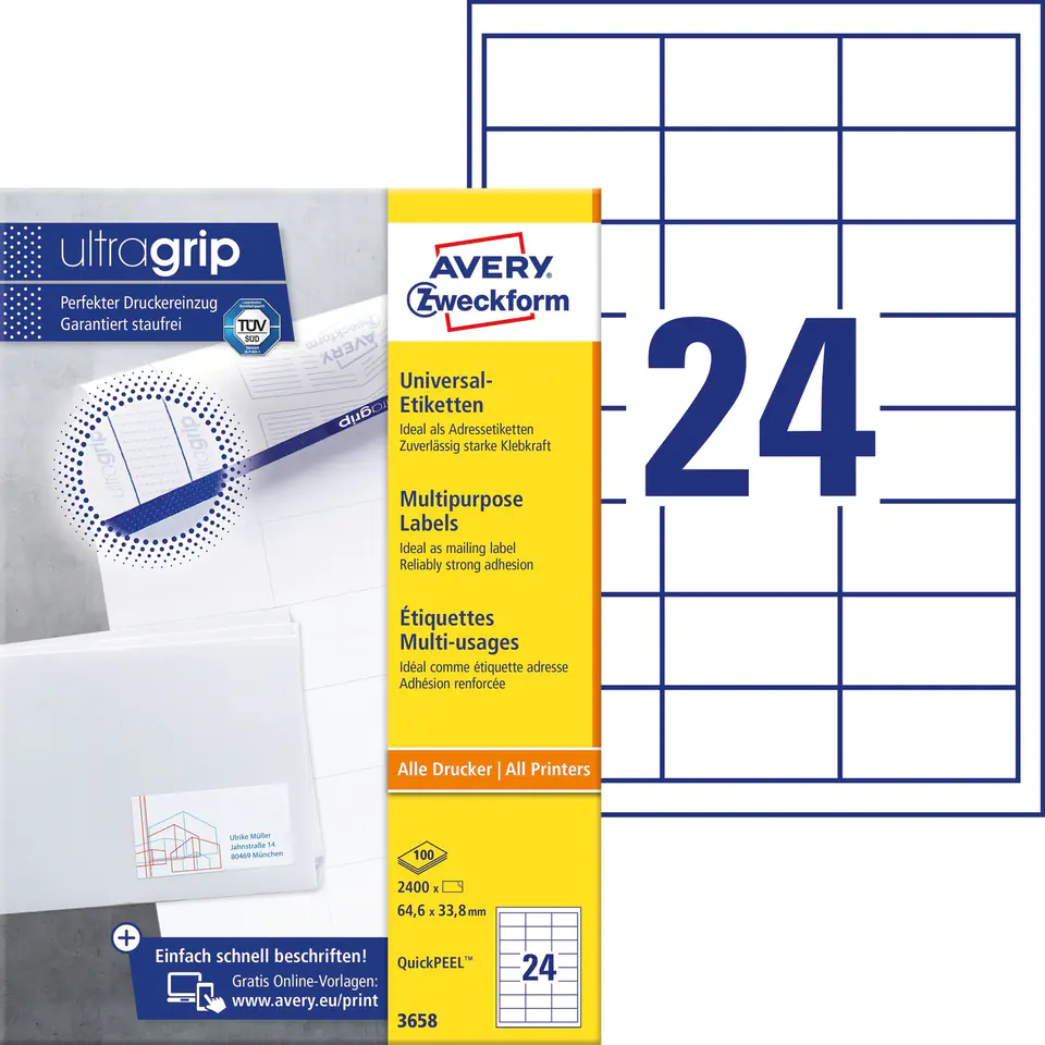 Innowacyjna technologia ultragrip opatentowana przez Avery Zweckform gwarantuje precyzyjne podawanie i równomierne prowadzenie arkusza oraz idealne drukowanie etykiet samoprzylepnych.