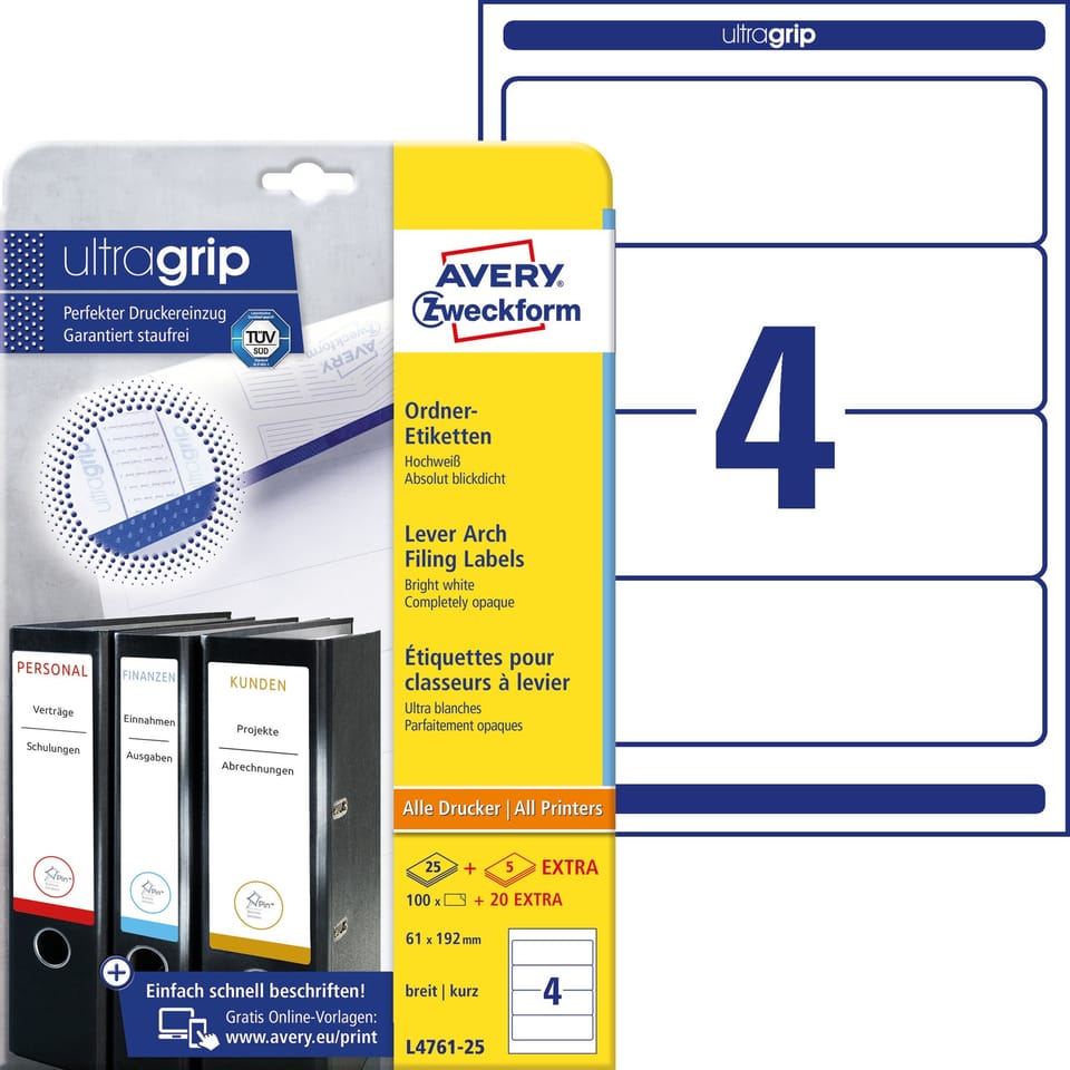 ETYKIETY NA SEGREGATORY, SZEROKIE, KRÓTKIE • Posiadają unikalną i nowoczesną technologię UltraGrip: trójwymiarowa powierzchnia na arkuszach gwarantuje równomierne pobieranie i prowadzenie etykiet w drukarce • W opakowaniu znajduje się aż 5 dodatkowych arkuszy EXTRA! • Kryjący materiał zasłania stare oznaczenia, więc można wielokrotnie wykorzystywać te same segregatory • Silnie przylegają do grzbietu segregatora • Pasują do większości szerokich, krótkich segregatorów dostępnych na rynku • Wysokiej jakości biały papier premium gwarantuje elegancki i profesjonalny wygląd etykiet • Gwarantowany brak zacięć podczas zadruku w drukarkach laserowych potwierdzony certyfikatem TUV • Posiadają certyfikat FSC – papier z ekologicznie zarządzanych obszarów leśnych • Do zadruku w drukarkach atramentowych, laserowych i kserokopiarkach • Darmowe i łatwe w użyciu szablony oraz oprogramowanie dostępne na stronie www.avery-zweckform.pl