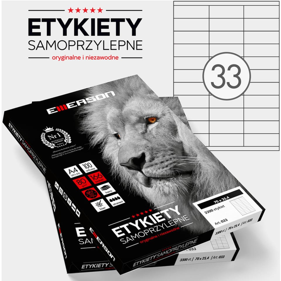 * białe etykiety samoprzylepne dostarczane są na arkuszach o formacie A4 * współpracują ze wszystkimi rodzajami drukarek igłowych, atramentowych i z większością drukarek laserowych (patrz zalecenia producenta drukarki) * dostępne w wersji z tzw. Quatro Clean Technology ? tj. z krawędziami bezpieczeństwa, które zapobiegają odkładaniu się kleju na mechanizmie drukarki * opakowanie etykiet zawiera 100 arkuszy A4 * w kartonie znajduje się 10 opakowań * na stronie www.emerson.pl dostępny jest darmowy program do wypełniania etykiet