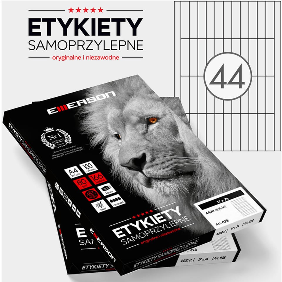 * białe etykiety samoprzylepne dostarczane są na arkuszach o formacie A4 * współpracują ze wszystkimi rodzajami drukarek igłowych, atramentowych i z większością drukarek laserowych (patrz zalecenia producenta drukarki) * dostępne w wersji z tzw. Quatro Clean Technology ? tj. z krawędziami bezpieczeństwa, które zapobiegają odkładaniu się kleju na mechanizmie drukarki * opakowanie etykiet zawiera 100 arkuszy A4 * w kartonie znajduje się 10 opakowań * na stronie www.emerson.pl dostępny jest darmowy program do wypełniania etykiet