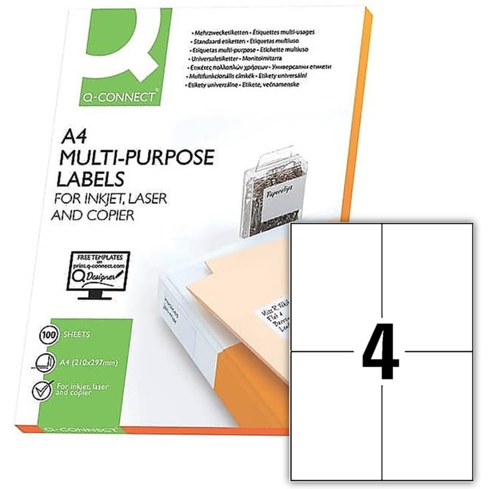 * klasyczne etykiety samoprzylepne, odpowiednie do drukarek laserowych, atramentowych i kserokopiarek * rozmiar etykiety: 105x148,5mm * liczba etykiet na arkuszu: 4 * gramatura: front 70gsm, podkład 55gsm * białość: 150 CIE * QCT - Quatro Clean Technology - ochronne pole wzdłuż krawędzi etykiety, które zapobiega odkładaniu się kleju na mechanizmie drukarki * na tylnej stronie opakowania widok 1:1 rozkładu etykiet na arkuszu * posiadają certyfikat FSC, który gwarantuje, że papier pochodzi z ekologicznie zarządzanych obszarów leśnych * możliwość pobrania darmowego programu do projektowania i wydruku etykiet Q-CONNECT SOFT kompatybilny również z oprogramowaniem Windows 7 dostępny na Q-CONNECT.com lub pbspolska.eu * 100 arkuszy w j.s. * kolor biały