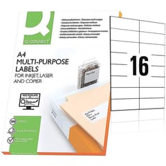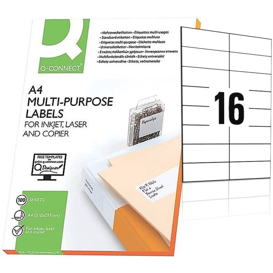 * klasyczne etykiety samoprzylepne, odpowiednie do drukarek laserowych, atramentowych i kserokopiarek * rozmiar etykiety: 105x37mm * liczba etykiet na arkuszu: 16 * gramatura: front 70gsm, podkład 55gsm * białość: 150 CIE * QCT - Quatro Clean Technology - ochronne pole wzdłuż krawędzi etykiety, które zapobiega odkładaniu się kleju na mechanizmie drukarki * na tylnej stronie opakowania widok 1:1 rozkładu etykiet na arkuszu * posiadają certyfikat FSC, który gwarantuje, że papier pochodzi z ekologicznie zarządzanych obszarów leśnych * możliwość pobrania darmowego programu do projektowania i wydruku etykiet Q-CONNECT SOFT kompatybilny również z oprogramowaniem Windows 7 dostępny na Q-CONNECT.com lub pbspolska.eu * 100 arkuszy w j.s. * kolor biały
