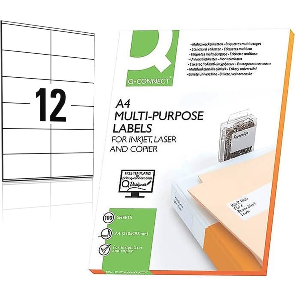 * klasyczne etykiety samoprzylepne, odpowiednie do drukarek laserowych, atramentowych i kserokopiarek * rozmiar etykiety: 105x48mm * liczba etykiet na arkuszu: 12 * gramatura: front 70gsm, podkład 55gsm * białość: 150 CIE * QCT - Quatro Clean Technology - ochronne pole wzdłuż krawędzi etykiety, które zapobiega odkładaniu się kleju na mechanizmie drukarki * na tylnej stronie opakowania widok 1:1 rozkładu etykiet na arkuszu * posiadają certyfikat FSC, który gwarantuje, że papier pochodzi z ekologicznie zarządzanych obszarów leśnych * możliwość pobrania darmowego programu do projektowania i wydruku etykiet Q-CONNECT SOFT kompatybilny również z oprogramowaniem Windows * 7 dostępny na Q-CONNECT.com lub pbspolska.eu * 100 arkuszy w j.s. * kolor biały