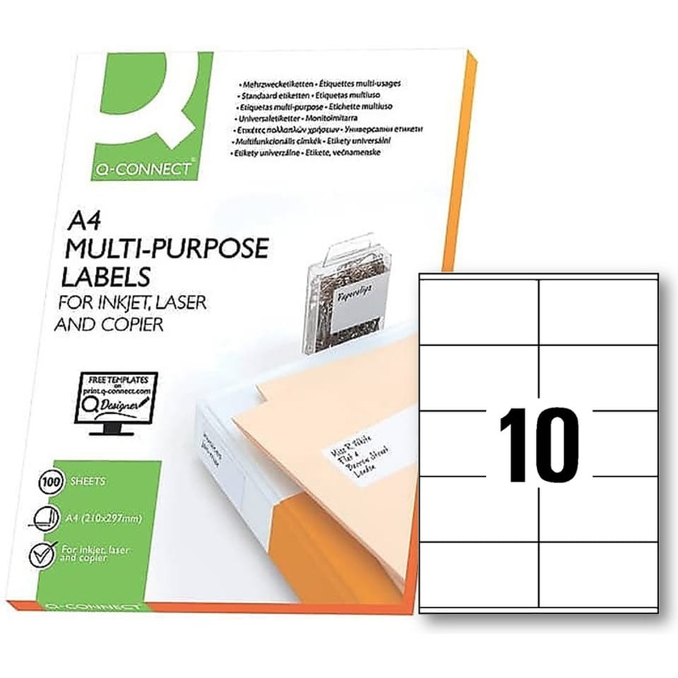 * klasyczne etykiety samoprzylepne, odpowiednie do drukarek laserowych, atramentowych i kserokopiarek * rozmiar etykiety: 105x57mm * liczba etykiet na arkuszu: 10 * gramatura: front 70gsm, podkład 55gsm * białość: 150 CIE * QCT - Quatro Clean Technology - ochronne pole wzdłuż krawędzi etykiety, które zapobiega odkładaniu się kleju na mechanizmie drukarki * na tylnej stronie opakowania widok 1:1 rozkładu etykiet na arkuszu * posiadają certyfikat FSC, który gwarantuje, że papier pochodzi z ekologicznie zarządzanych obszarów leśnych * możliwość pobrania darmowego programu do projektowania i wydruku etykiet Q-CONNECT SOFT kompatybilny również z oprogramowaniem Windows 7 dostępny na Q-CONNECT.com lub pbspolska.eu * 100 arkuszy w j.s. * kolor biały