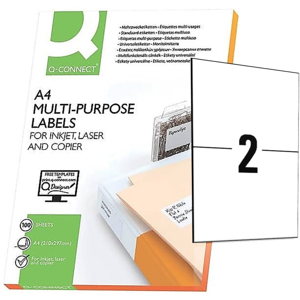 * klasyczne etykiety samoprzylepne, odpowiednie do drukarek laserowych, atramentowych i kserokopiarek * zaokrąglone końce * rozmiar etykiety: 210x148,5mm * liczba etykiet na arkuszu: 2 * gramatura: front 70gsm, podkład 55gsm * białość: 150 CIE * QCT - Quatro Clean Technology - ochronne pole wzdłuż krawędzi etykiety, które zapobiega odkładaniu się kleju na mechanizmie drukarki * na tylnej stronie opakowania widok 1:1 rozkładu etykiet na arkuszu * posiadają certyfikat FSC, który gwarantuje, że papier pochodzi z ekologicznie zarządzanych obszarów leśnych * możliwość pobrania darmowego programu do projektowania i wydruku etykiet Q-CONNECT SOFT kompatybilny również z oprogramowaniem Windows 7 dostępny na Q-CONNECT.com lub pbspolska.eu * 100 arkuszy w j.s. * kolor biały