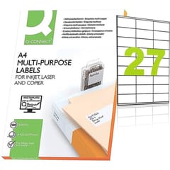 * klasyczne etykiety samoprzylepne, odpowiednie do * drukarek laserowych, atramentowych i kserokopiarek * rozmiar etykiety: 70x30mm * liczba etykiet na arkuszu: 27 * gramatura: front 70gsm, podkład 55gsm * białość: 150 CIE * QCT - Quatro Clean Technology - ochronne pole wzdłuż krawędzi etykiety, które zapobiega odkładaniu się kleju na mechanizmie drukarki * na tylnej stronie opakowania widok 1:1 rozkładu etykiet na arkuszu * posiadają certyfikat FSC, który gwarantuje, że papier pochodzi z ekologicznie zarządzanych obszarów leśnych * możliwość pobrania darmowego programu do projektowania i wydruku etykiet Q-CONNECT SOFT kompatybilny również z oprogramowaniem Windows * 7 dostępny na Q-CONNECT.com lub pbspolska.eu * 100 arkuszy w j.s. * kolor biały