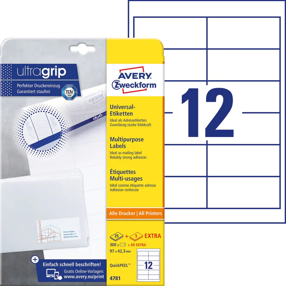 * TRWAŁE ETYKIETY UNIWERSALNE DO WSZECHSTRONNYCH ZASTOSOWAŃ (papierowe: białe) * Posiadają unikalną i nowoczesną technologię UltraGrip: trójwymiarowa powierzchnia z tyłu arkusza gwarantuje równomierne pobieranie i prowadzenie arkusza w drukarce. * W opakowaniu znajduje się 5 dodatkowych arkuszy EXTRA! * Etykiety samoprzylepne do wszechstronnych zastosowań. Idealne do adresowania kopert i przesyłek pocztowych, oznaczania dokumentów, produktów i wielu innych zadań. * Przeznaczone do wszystkich typów drukarek atramentowych, laserowych oraz kserokopiarek. * Gwarancja braku zacięć w drukarkach laserowych przetestowana i zatwierdzona przez TÜV. * Ostry obraz bez rozmazywania tuszu i tonera. * Wybrane rozmiary posiadają unikalny system QuickPEEL™ ułatwiający odrywanie i szybsze przyklejanie etykiet. * Ekologiczne etykiety z certyfikatem FSC podlegające pełnej utylizacji jako odpad papierowy. * Supermocny klej, dzięki czemu etykiety doskonale przylegają również do kartonów. * Darmowe i łatwe w użyciu szablony oraz oprogramowanie dostępne na stronie www.avery-zweckform.pl. * Kolor: białe * Rozmiar: 97 x 42,3 mm * Liczba arkuszy w opakowaniu: 30 25+5 arkuszy za darmo * Format: A4 * Producent: Avery Zweckform