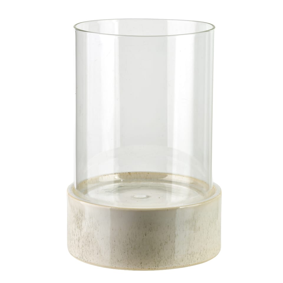 EVAM BEIGE . Szklany Świecznik na Ceramicznej Podstawie (21 cm)Większy świecznik z kolekcji EVAM BEIGE to stylowy element dekoracyjny, który łączy nowoczesny minimalizm z naturalnym wykończeniem. Produkt składa się z wysokiego, szklanego klosza o prostej formie oraz solidnej, ceramicznej bazy. Podstawa w kolorze ciepłego beżu została ozdobiona subtelnym nakrapianiem, co nadaje jej unikalnego, rzemieślniczego charakteru i nawiązuje do stylistyki eko oraz japandi. Przezroczyste szkło nie tylko chroni płomień świecy przed podmuchami wiatru, ale także pozwala na pełne rozproszenie światła, tworząc w pomieszczeniu wyjątkową atmosferę sprzyjającą relaksowi. Dzięki pokaźnym wymiarom 18 x 18 x 21 cm, świecznik ten doskonale sprawdzi się jako główna ozdoba stołu jadalnianego lub wyrazisty akcent na tarasie i w salonie. Stanowi on idealne dopełnienie mniejszego modelu oraz figurki ptaka z tej samej serii, pozwalając na stworzenie spójnej i eleganckiej kompozycji w Twoim domu.Specyfikacja produktu: Świecznik ma wymiary 18 x 18 x 21 cm. Został wykonany z wysokiej jakości szkła oraz beżowej, nakrapianej ceramiki. Produkt należy do linii dekoracji EVAM BEIGE.