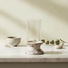 EVAM. Szklany Świecznik na Dekoracyjnej Podstawie (24 cm)Świecznik z kolekcji EVAM o wysokości 24 cm to wyrafinowane połączenie klasycznej formy z ozdobnym detalem, które wprowadzi do każdego wnętrza elegancki klimat. Produkt charakteryzuje się smukłym, szklanym kloszem o cylindrycznym kształcie, osadzonym na efektownej, ceramicznej stopie o zwężającej się ku górze sylwetce. Podstawa została wykonana z jasnej ceramiki i ozdobiona gęstym, fioletowym wzorem o roślinnym motywie, co nadaje całości unikalny i luksusowy charakter. Przezroczyste szkło klosza nie tylko pięknie rozprasza światło umieszczonej wewnątrz świecy, ale również stanowi praktyczną osłonę przed podmuchami powietrza. Dzięki wymiarom 14,5 x 14,5 x 24 cm świecznik ten doskonale sprawdzi się jako centralna dekoracja stołu podczas uroczystych kolacji lub jako nastrojowy akcent na komodzie, idealnie komponując się z wnętrzami w stylu klasycznym oraz modern classic.Specyfikacja produktu: Świecznik posiada wymiary 14,5 x 14,5 x 24 cm. Został wykonany z wysokiej jakości szkła oraz ceramiki zdobionej fioletowym deseniem roślinnym. Produkt jest częścią artystycznej kolekcji EVAM.