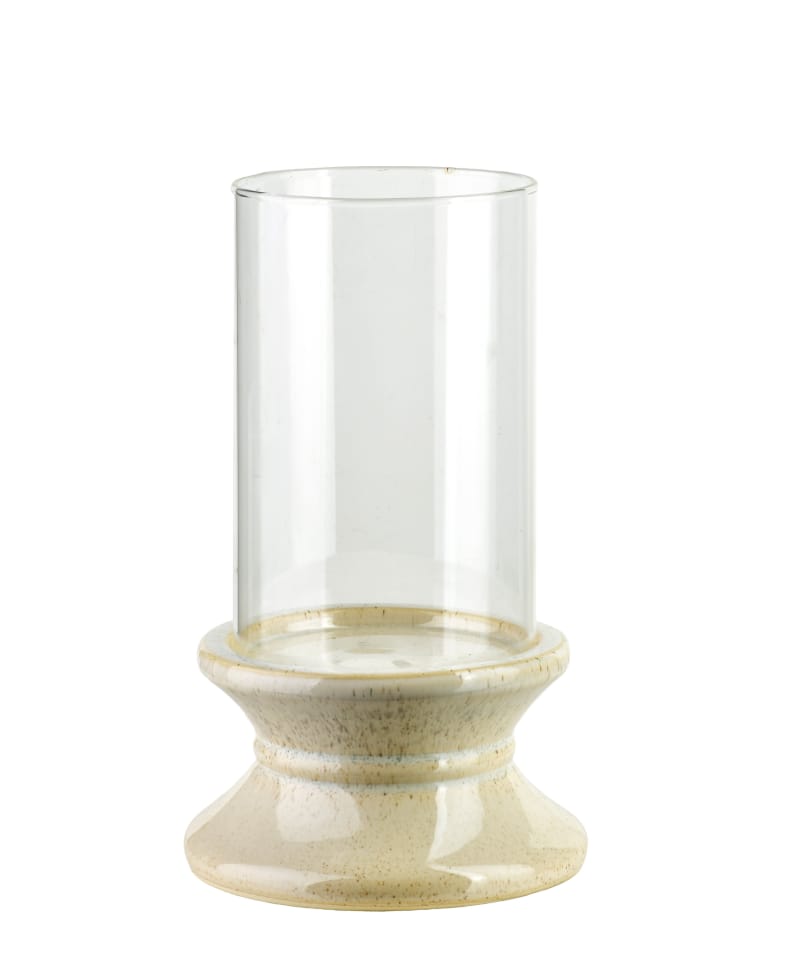 EVAM . Szklany Świecznik na Beżowej Podstawie (24 cm)Świecznik z kolekcji EVAM to stylowa dekoracja, która wnosi do wnętrza spokój i naturalną elegancję. Produkt charakteryzuje się harmonijnym połączeniem przezroczystego, szklanego klosza o cylindrycznym kształcie z ozdobną ceramiczną stopą. Podstawa świecznika została wykonana w stonowanym odcieniu beżu z delikatnym, ciemniejszym nakrapianiem, co nadaje jej rzemieślniczego charakteru i nawiązuje do estetyki naturalnej kamionki. Wyprofilowany kształt stopy zapewnia stabilność całej konstrukcji, a szklany cylinder skutecznie osłania płomień świecy przed podmuchami powietrza, tworząc bezpieczne i nastrojowe źródło światła. Dzięki wymiarom 14,5 x 14,5 x 24 cm oraz uniwersalnej kolorystyce, świecznik ten doskonale odnajdzie się w aranżacjach typu boho, scandi czy japandi, stanowiąc subtelną ozdobę stołu, komody lub parapetu.Specyfikacja produktu: Wymiary świecznika wynoszą 14,5 x 14,5 x 24 cm. Został on wykonany z wysokiej jakości szkła oraz nakrapianej ceramiki w kolorze beżowym. Produkt należy do eleganckiej linii dekoracji domowych EVAM.