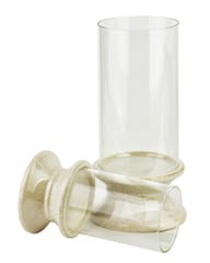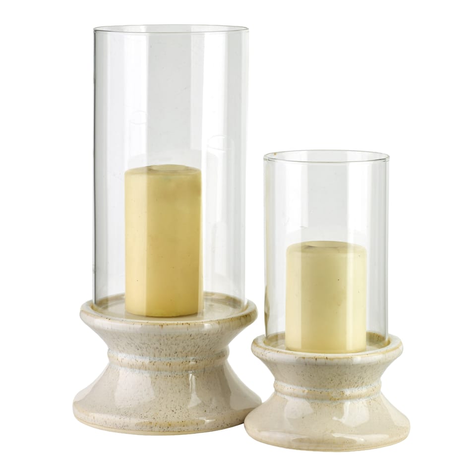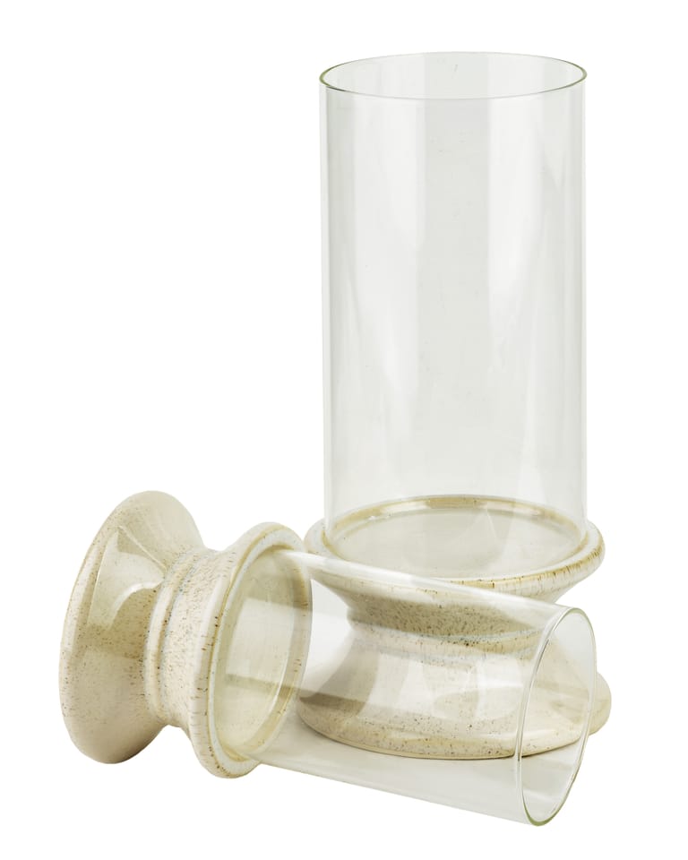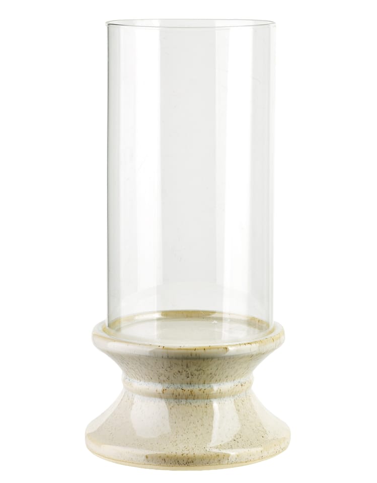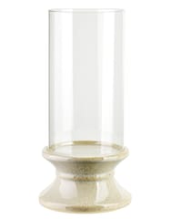 EVAM . Wysoki Szklany Świecznik na Beżowej Podstawie (35 cm)Wysoki świecznik z kolekcji EVAM o wysokości 35 cm to imponująca dekoracja, która łączy w sobie surowość naturalnych materiałów z elegancką, smukłą formą. Produkt składa się z wydłużonego, szklanego klosza o cylindrycznym kształcie oraz solidnej, ceramicznej stopy o charakterystycznym, profilowanym kształcie. Podstawa w odcieniu ciepłego beżu została wykończona delikatnym nakrapianiem, co nawiązuje do stylistyki kamionki i sprawia, że każdy egzemplarz zyskuje unikalny, rzemieślniczy wygląd. Przezroczyste szkło klosza pięknie eksponuje blask świecy, zapewniając jednocześnie bezpieczne użytkowanie i ochronę płomienia przed podmuchami powietrza. Dzięki swoim pokaźnym wymiarom 17,5 x 17,5 x 35 cm, świecznik ten stanowi wyrazisty akcent dekoracyjny, który idealnie zaprezentuje się na podłodze, niskiej konsoli lub jako centralny punkt na dużym stole w jadalni. Jest to doskonały wybór do wnętrz urządzonych w duchu minimalizmu, stylu skandynawskiego czy japandi, gdzie liczy się harmonia i naturalna kolorystyka.Specyfikacja produktu: Świecznik posiada wymiary 17,5 x 17,5 x 35 cm. Został wykonany z wysokiej jakości szkła oraz ceramiki w kolorze beżowym z efektem nakrapiania. Produkt jest częścią spójnej linii dekoracji domowych EVAM.