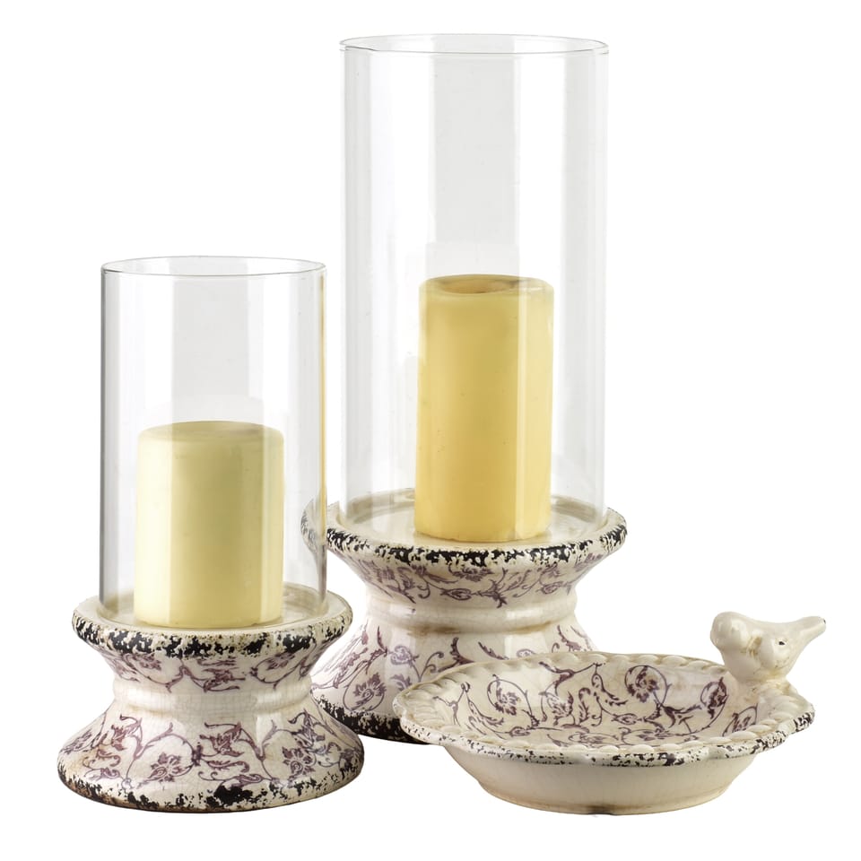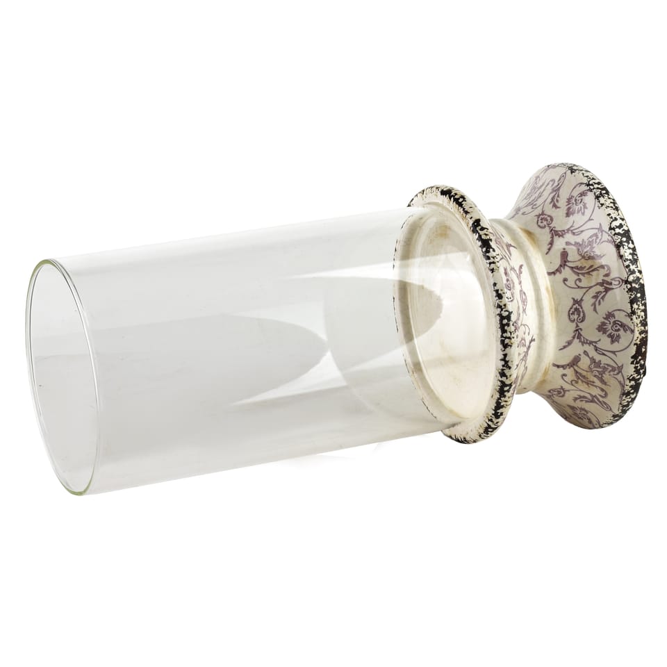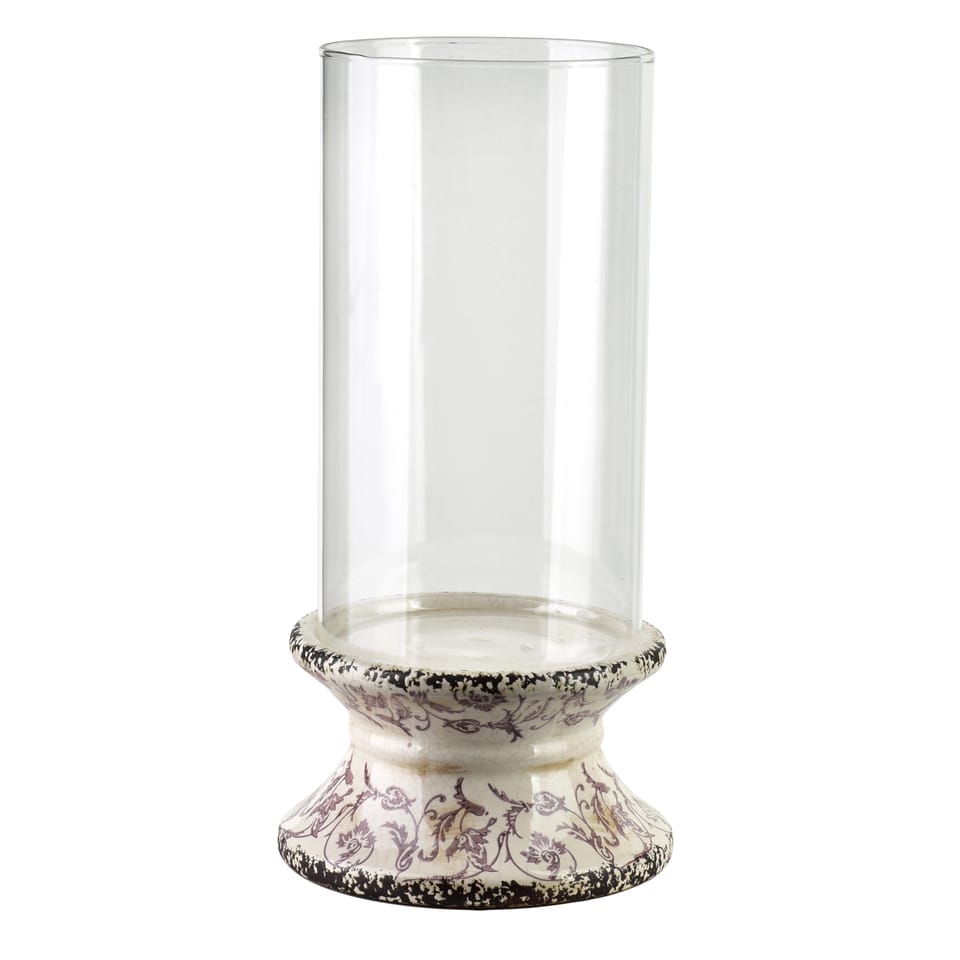 Oto opis większego świecznika z linii EVAM, przygotowany w formie płynnego tekstu bez podpunktów:EVAM. Wysoki Szklany Świecznik na Dekoracyjnej Podstawie (35 cm) Okazały świecznik z kolekcji EVAM o wysokości 35 cm to dekoracja o wyjątkowych walorach estetycznych, która stanie się luksusowym akcentem w każdym salonie lub jadalni. Produkt charakteryzuje się smukłą i wysoką sylwetką, uzyskaną dzięki połączeniu wydłużonego, szklanego klosza z elegancką, ceramiczną stopą. Podstawa naczynia, o profilowanym kształcie, została ozdobiona kunsztownym roślinnym wzorem w odcieniu głębokiego fioletu, który pięknie odcina się na jasnym tle ceramiki. Przezroczysty, cylindryczny klosz zapewnia bezpieczne spalanie świecy i idealne rozproszenie blasku, tworząc we wnętrzu niepowtarzalną, nastrojową atmosferę. Dzięki imponującym wymiarom 17,5 x 17,5 x 35 cm świecznik ten doskonale prezentuje się jako samodzielna ozdoba na kominku, konsoli lub jako element rozbudowanej, wielopoziomowej kompozycji świetlnej. Wyjątkowy design serii EVAM sprawia, że jest to idealny wybór do wnętrz urządzonych w stylu klasycznym, romantycznym oraz glamour.Specyfikacja produktu: Świecznik posiada wymiary 17,5 x 17,5 x 35 cm. Został wykonany z wysokiej jakości szkła oraz ceramiki zdobionej fioletowym motywem kwiatowym. Produkt należy do eleganckiej kolekcji akcesoriów domowych EVAM.