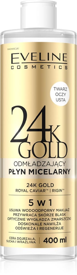 Odmładzający płyn micelarny 5w1 24K Gold Eveline Cosmetics to bogata formuła oparta na zaawansowanych składnikach aktywnych, która głęboko oczyszcza skórę, doskonale usuwając nawet wodoodporny makijaż z twarzy, oczu i ust. Działa kojąco i łagodząco, bez konieczności spłukiwania czy pocierania. Idealnie pielęgnuje skórę, pozostawiając ją nawilżoną i wygładzoną.