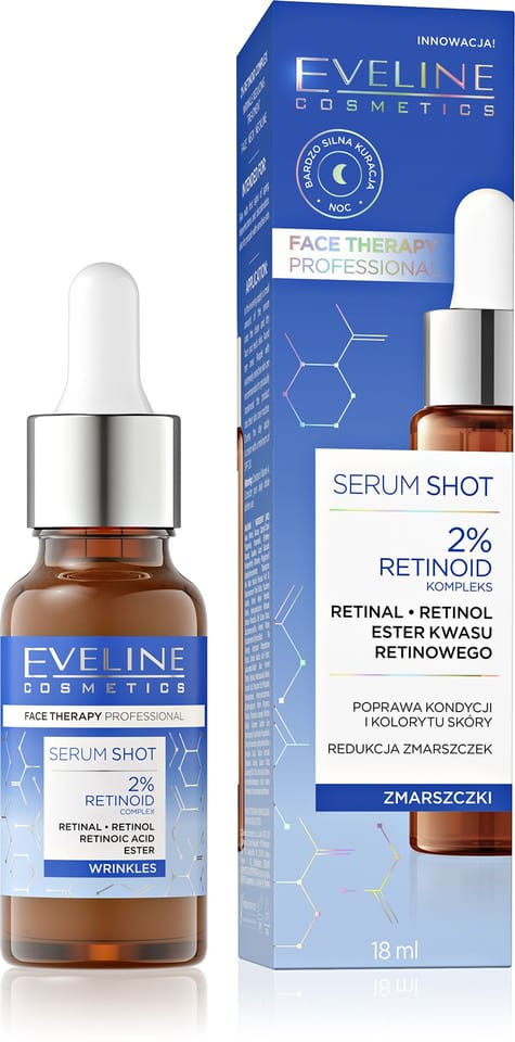 Serum Shot z linii Face Therapy Professional to zaawansowana pielęgnacja, która dzięki 2% kompleksowi retinoidów, efektywnie przeciwdziała oznakom starzenia. Serum przeznaczone do skóry twarzy, szyi oraz dekoltu, dedykowane osobom borykającym się z pierwszymi zmarszczkami, nierównomiernym kolorytem oraz utratą elastyczności. Regularne stosowanie produktu prowadzi do widocznej poprawy kondycji skóry — staje się ona gładsza, bardziej nawilżona i jędrna, a jej struktura wyraźnie ujednolica się.