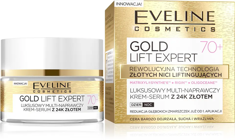 LUKSUSOWY MULTI-NAPRAWCZY KREM-SERUM 70+ intensywnie regeneruje i odżywia głębokie warstwy skóry, a dzięki zawartości silnie działających kompleksów ANTI-AGE stymuluje wielowymiarowy lifting poprzez: