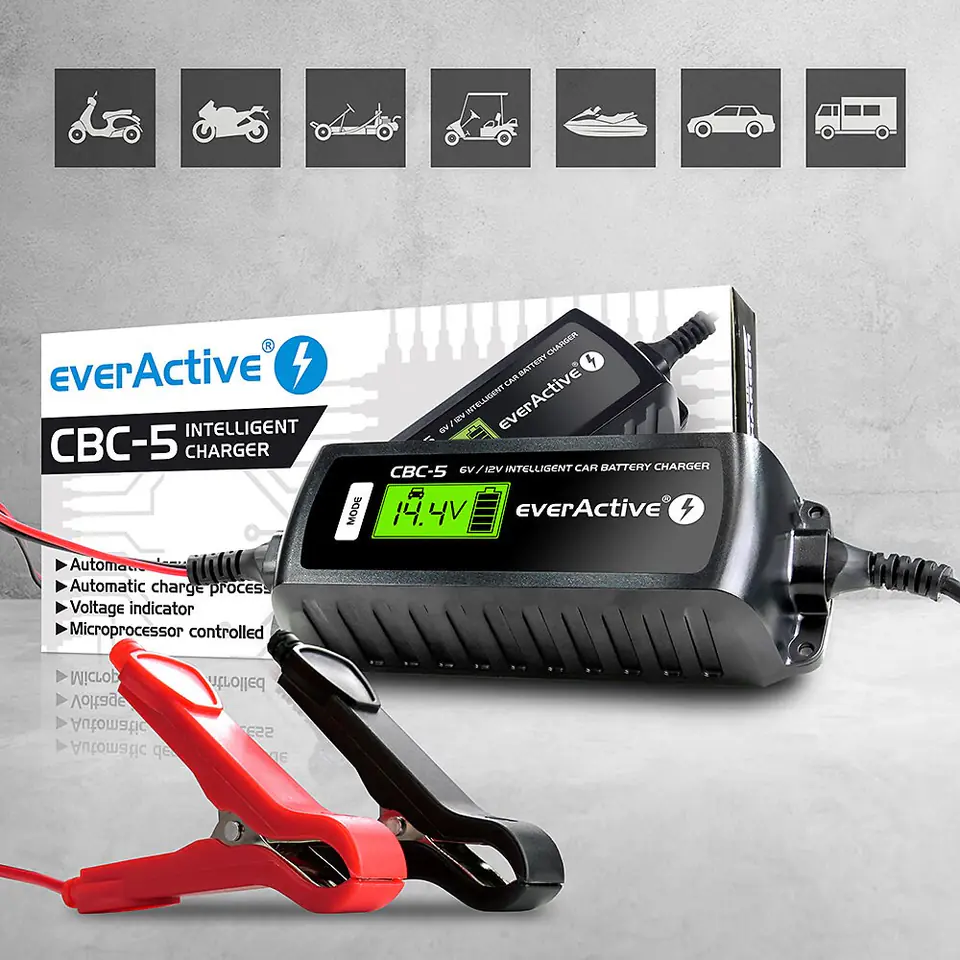 Ładowarka procesorowa, prostownik samochodowy automatyczny do akumulatora 6V / 12V everActive CBC-5