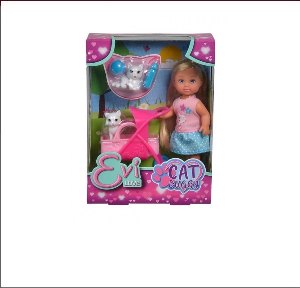 Laleczka Evi opiekuje się 2 kociętami, ma do dyspozycji wózek i zabawki dla pupili, wys: 12cm,