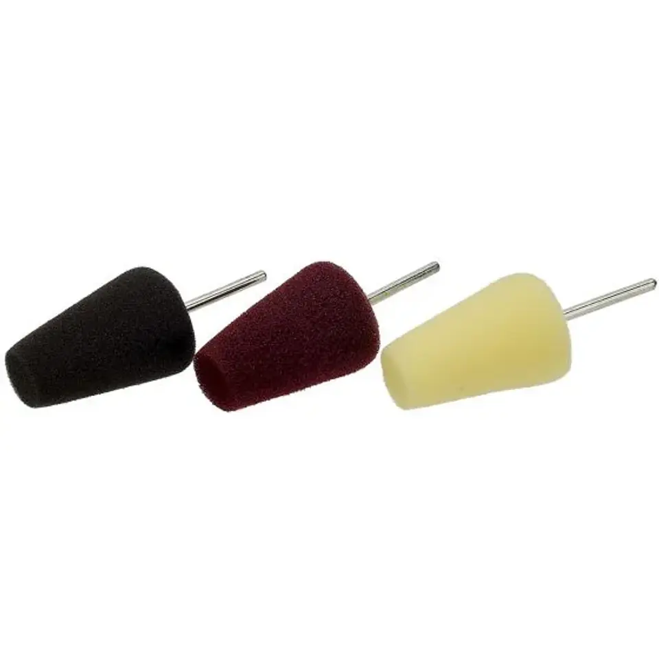 Zestaw obejmuje trzy stożkowe pady polerskie Evoxa montowane na trzpieniu 3 mm. Sprawdzają się przy pracy w miejscach, do których trudno dotrzeć klasycznymi akcesoriami, takich jak felgi, okolice klamek, słupki czy wąskie krawędzie. Kształt stożka ułatwia precyzyjne manewrowanie, a struktura pianki wspiera odprowadzanie ciepła podczas dłuższej obróbki.