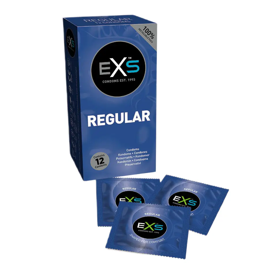 EXS Regular klasyczne prezerwatywy 12szt. (P1)5027701000226Regularnbsptonbspklasyczne, wytrzymałe prezerwatywynbspzaprojektowane z rozszerzoną końcówką dla lepszego dopasowania i uczucia naturalnej wygody. Prezerwatywy Regular zostały stworzone z myślą o tych, którzy lubią klasyczne podejście do sprawy. Przezroczyste, wykonane z lateksu, nawilżane - te wszystkie zalety klasyki pozwolą Ci cieszyć się z chwil spędzonych w duecie.- przezroczyste, z rozszerzoną końcówką- wykonane z lateksu kauczuku naturalnego- o kształcie cylindrycznym, zakończone zbiorniczkiem- nawilżane silikonem- długość: 190 mm- szerokość: 54 mm- grubość ścianki 0.07mm- bez zapachu lateksu!