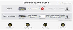 | Wybrane cechy: | Daleki zasięg ≤ 250 m - 10Mbps (10 BASE-T) Gigabit PoE ≤ 100 m Lekki i łatwy w obsłudze Możliwość montażu na ścianie |