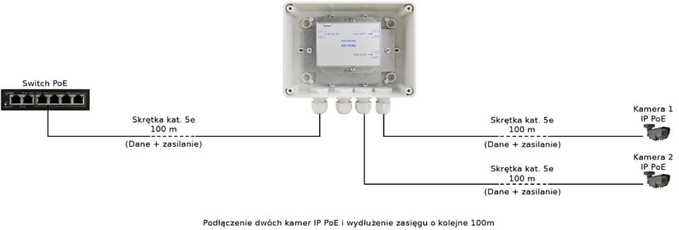 EXT-POE2H zwiększa zasięg danych Ethernet oraz zasilania PoE o kolejne 100 metrówNapięcie wyjściowe jest zgodne z napięciem wejściowym