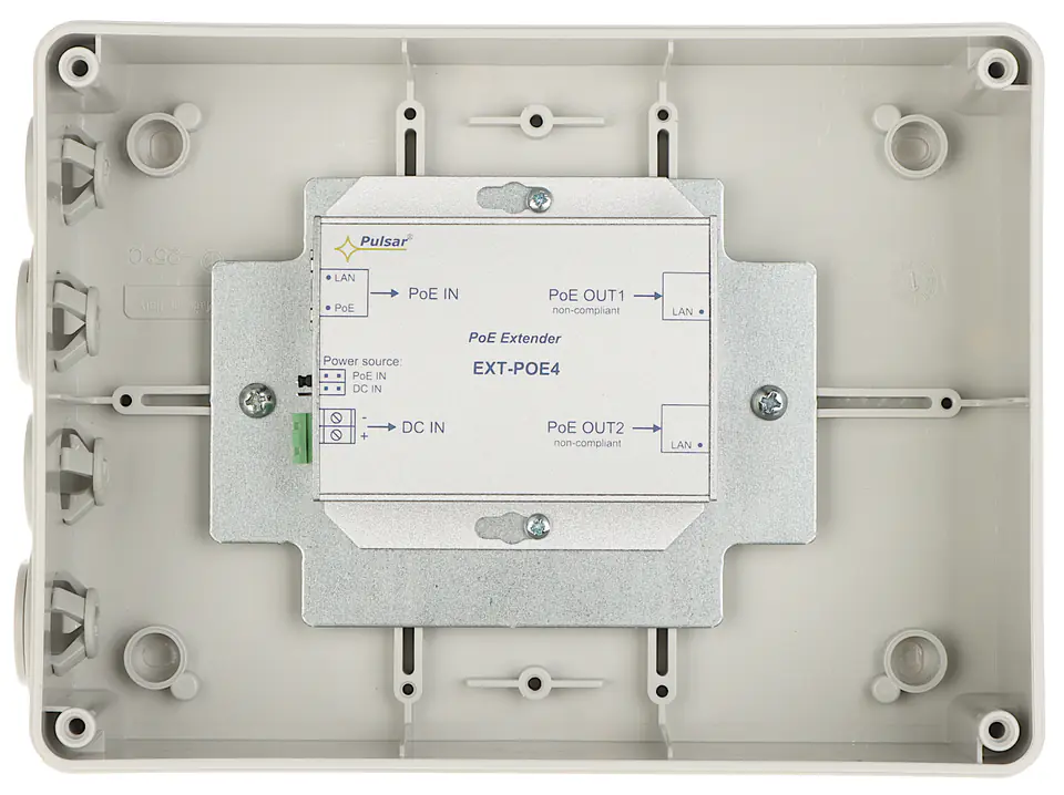 EXT-POE4H zwiększa zasięg danych Ethernet oraz zasilania PoE o kolejne 100 metrówUrządzenie może być zasilane poprzez podanie napięcia bezpośrednio na pary skrętki 4/5 i 7/8, jak i lokalnie za pomocą zasilacza 48V DC (wyboru źródła zasilania dokonuje się za pomocą zworki konfiguracyjnej)Napięcie wyjściowe jest zgodne z napięciem wejściowym