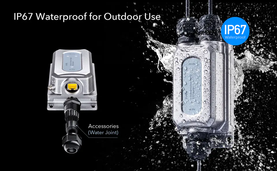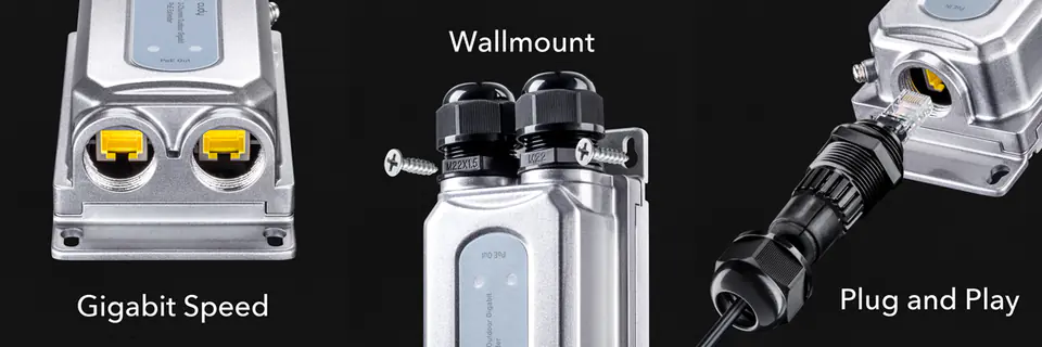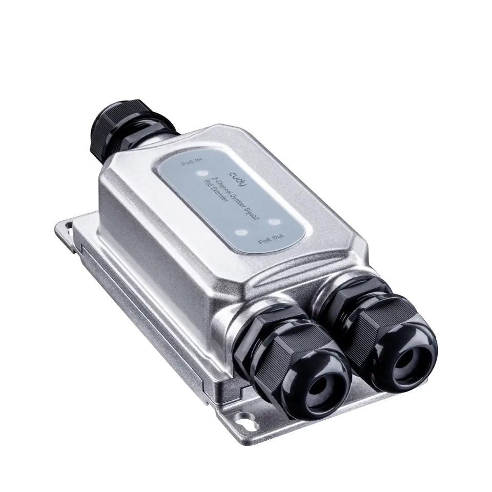 Extender POE+ posiada porty Gigabitowe ( 10/100/100 Mbps) na wejściu i wyjściu. Dzięki temu można uzyskać przesył na danych na najwyższym poziomie. Urządzenie możemy też zamocować na ścianie za pomocą wkrętów. Bardzo przydatna jest tutaj funkcji Plug & Play- wystarczy podpiąć kable i dokręcić nakrętki uszczelniające.