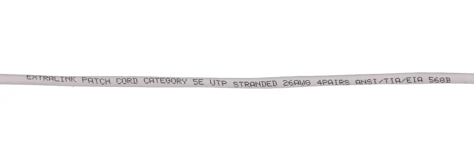 Patchcord kategorii 5e UTP marki Extralink zakończony pozłacanymi wtykami RJ45, 4 pary przewodów z czystej miedzi z powłoką PE. Zewnętrzny płaszcz PVC.