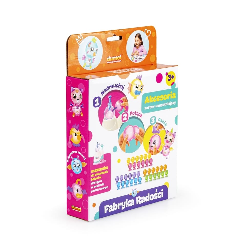 Daj wyraz własnej kreatywności, tworząc balonowe stworki! Zestaw akcesoriów to uzupełnienie do zestawu podstawowego, Fabryka Radości – Balony. Znajdziesz w nim aż 162 elementy, a wśród nich kolorowe balony, naklejki i wesołe oczka, z którymi stworzysz jeszcze więcej balonowych postaci.