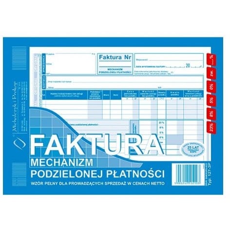 * jednostka sprzedaży: 1 bloczek * faktura mechanizm podzielonej płatności dla prowadzących sprzedaż w cenach netto * zastosowanie: faktury i inne dokumenty wynikające z przepisów o podatku od towarów i usług * format: A5 * rodzaj papieru: samokopiujący * oprawa: bloczek 80 kartek * druk: jednostronny (oryginał + kopia)