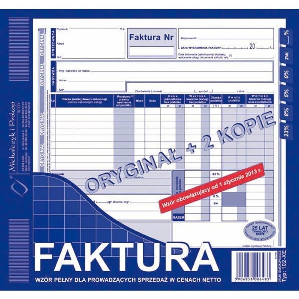 102-XE FAKTURA WZÓR PEŁNY DLA PROWADZĄCYCH SPRZEDAŻ W CENACH NETTO * format: 2/3 A4 * rodzaj papieru: samokopiujący * zastosowanie: faktury i inne dokumenty wynikające z przepisów o podatku od towarów i usług * oprawa: bloczek 81 kartek * druk: jednostronny (oryginał + 2 kopie)